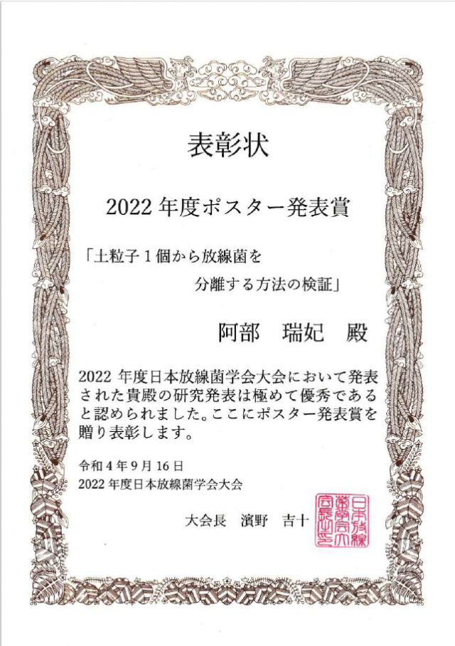 令和4年9月14日~16日、福井国際会館(福井市)で開催された「第36回(2022年度)日本放線菌学会大会」において、農学部生命機能科学コース4年生の阿部瑞妃さんがポスター発表賞を受賞しました(ポスター発表件数68件中の5件が受賞)。