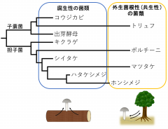 キノコを形成する菌類には、木材や土壌などの有機物を分解する分解者として生活する「腐生菌(注1」と、生きている植物と共生することでエネルギー源を獲得する「外生菌根菌」があります。外生菌根菌は、植物の根と結び付いて栄養交換による相利共生を行う「菌根菌(注2」と呼ばれる菌類の一群で、密に枝分かれした植物の根を菌糸が覆う独特の外見を持った「外生菌根」という共生器官をつくることが特徴のグループです。外生菌根菌はマツタケやトリュフ、ヤマドリタケ(ポルチーニ)のようにさまざまな系統の菌類でみられ、これらは独立に腐生菌から共生性を進化させた、収斂進化(注3であると考えられています (図1)。