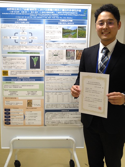小原涼太郎さんの研究は,松本市安曇の在来カブ品種で,信州の伝統野菜にも認定されている'稲核菜'の保全に必要な知見を得ることを目的として,生産者の自家採種状況の調査,自家不和合性に関するSハプロタイプを指標とした品種集団内の遺伝的多様性評価を行ったもので,中山間地域の在来カブ品種の遺伝的な実態を明らかにしたことが評価されました。
