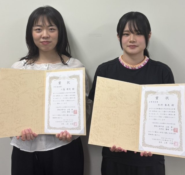 令和7年9月20日に名古屋大学で開催された日本農芸化学会中部支部第202回例会において、食品化学研究室の川島萌笑さん(修士1年)が学術奨励賞を、杉村奏美さん(修士1年)が企業奨励賞を受賞しました。本賞は優れた研究発表を行った若手研究者に授与されるものです。