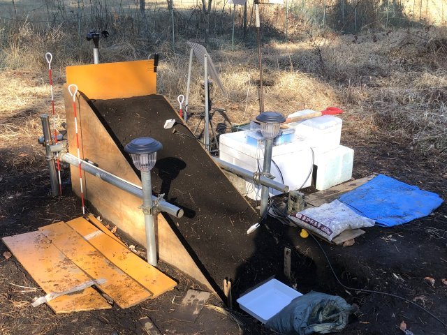 本研究では、屋外実験斜面(写真)において霜柱の形成と融解の過程、およびそれに伴う侵食土砂量を詳細に観測しました。その結果をもとに、霜柱による土砂生産量を、気温と降雨量という基本的な気象データのみを用いて簡便に予測できるモデルを構築しました。