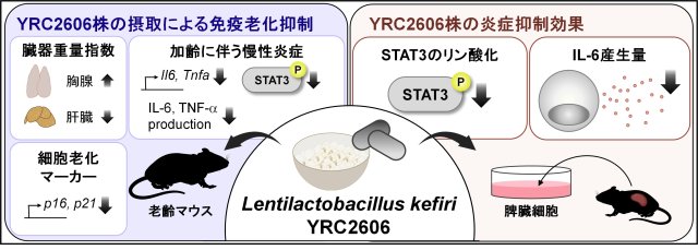 研究チームは、よつ葉乳業株式会社との共同研究を実施し、提供された発酵乳ケフィアの種菌であるケフィアグレイン由来乳酸菌Lentilactobacillus kefiri YRC2606を老齢マウスに摂取させ、免疫老化への影響を解析しました。その結果、YRC2606株を摂取したマウスでは、炎症性サイトカイン(IL-6、TNF-α)の発現および老化マーカーp16の発現が低下していました。これにより、YRC2606株が加齢に伴う慢性炎症を制御し、免疫システムの"若返り"に寄与する可能性が示されました(図1)。