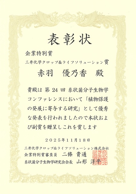 2025年11月17日~18日に名古屋大学で開催された第24回糸状菌分子生物学コンファレンスにおいて、微生物植物相互作用学研究室の赤羽優乃香さん(学部4年)がポスター発表を行い、「企業特別賞(三井化学クロップ&ライフソリューション賞)」を受賞しました(受賞日:11月18日)。