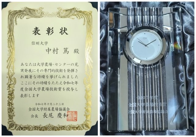 2025年10月23日~24日に北海道大学で開催された令和7年度全国大学附属農場協議会秋季全国協議会において、統合技術院(農学部)の中村篤技術専門員が技術賞を受賞しました。この賞は、農場等の教育・研究支援・管理運営への貢献及び農場等の活性化に特に功績のあった技術系の職員に授与されるものです。