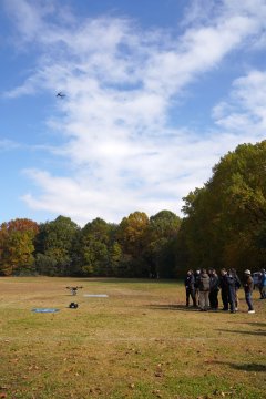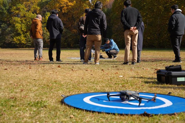発足2年目となる今年度は、13名の社会人受講生が参加し、11月8日(土)・9日(日) の2日間にわたり実地演習を行いました。演習では、外部講師であるドローンスクール「CROSS BIRD」のインストラクター指導のもと、ドローンの基本操作の体験、自律飛行による空撮データの取得、QGISによる解析実習を行いました。さらに、農学部グラウンドでは、産業用ドローンのデモンストレーション見学を行い、農薬・肥料散布に関する最新技術について情報交換を行いました。また、ドローン関連法令の講義やグループディスカッションを通じて、受講生同士がスマート農林業の役割や地域課題に対する活用可能性について意見を交わし、現場視点と技術知識を融合させた学びを深めました。