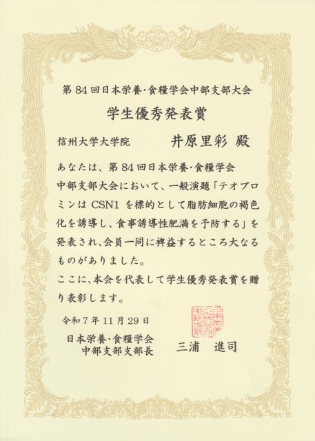 大学院総合理工学研究科農学専攻の井原里彩さん(M1)が第84回日本栄養・食糧学会中部支部大会において学生優秀発表賞を受賞