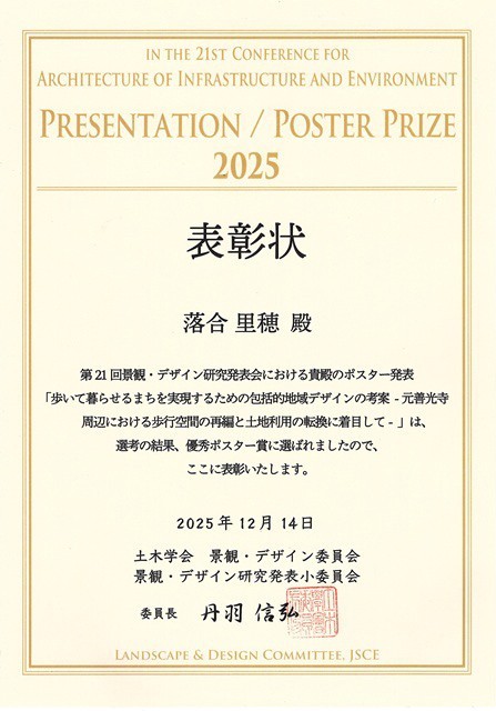 2025年12月14日に富山大学で開催された第21回土木学会景観・デザイン研究発表会において、ランドスケープ・プランニング共同研究講座の落合里穂さん(修士課程2025年度修了生)が「優秀ポスター賞」を受賞しました。