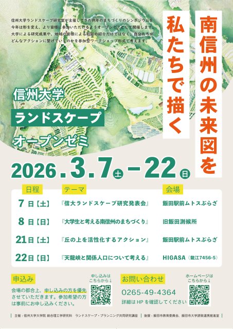 この度、信州大学大学院ランドスケープ・プランニング共同研究講座は、活動内容を広く地域の皆様に知っていただくとともに、プロジェクト実現に向けて意見交換を行うことを目的に、オープンゼミイベントを開催いたします。
