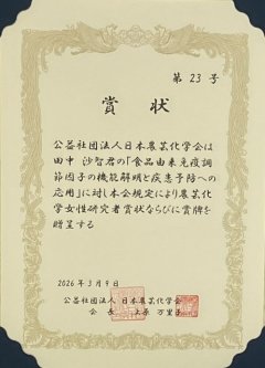 田中沙智教授が農芸化学女性研究者賞を受賞しました
