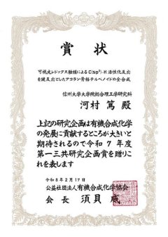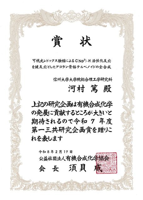 このたび、信州大学学術研究院(農学系)天然物化学研究室の河村 篤助教が「令和7年度 有機合成化学協会 第一三共研究企画賞」を受賞しました。