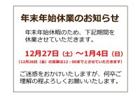 おすすめ直売品 年末年始休業のお知らせ 年末年始休暇のため、下記期間を休業とさせていただきます。 年末年始休業期間2025年12月27日(土)~2026年1月4日(日)(なお、12月26日(金)は12:00までの営業とさせていただきます) 下記期間内のFAX・メール等でのご注文品の発送および返信は、1月5日(月)以降となります。 ご不便をお掛けしますが、何卒ご理解とご協力の程、よろしくお願いいたします。 « 前の記事へ おすすめ直売品一覧に戻る