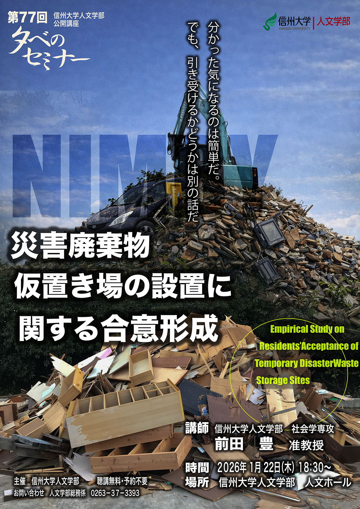 人文学部公開講座 第77回夕べのセミナー「災害廃棄物仮置き場の設置に関する合意形成」開催のお知らせ