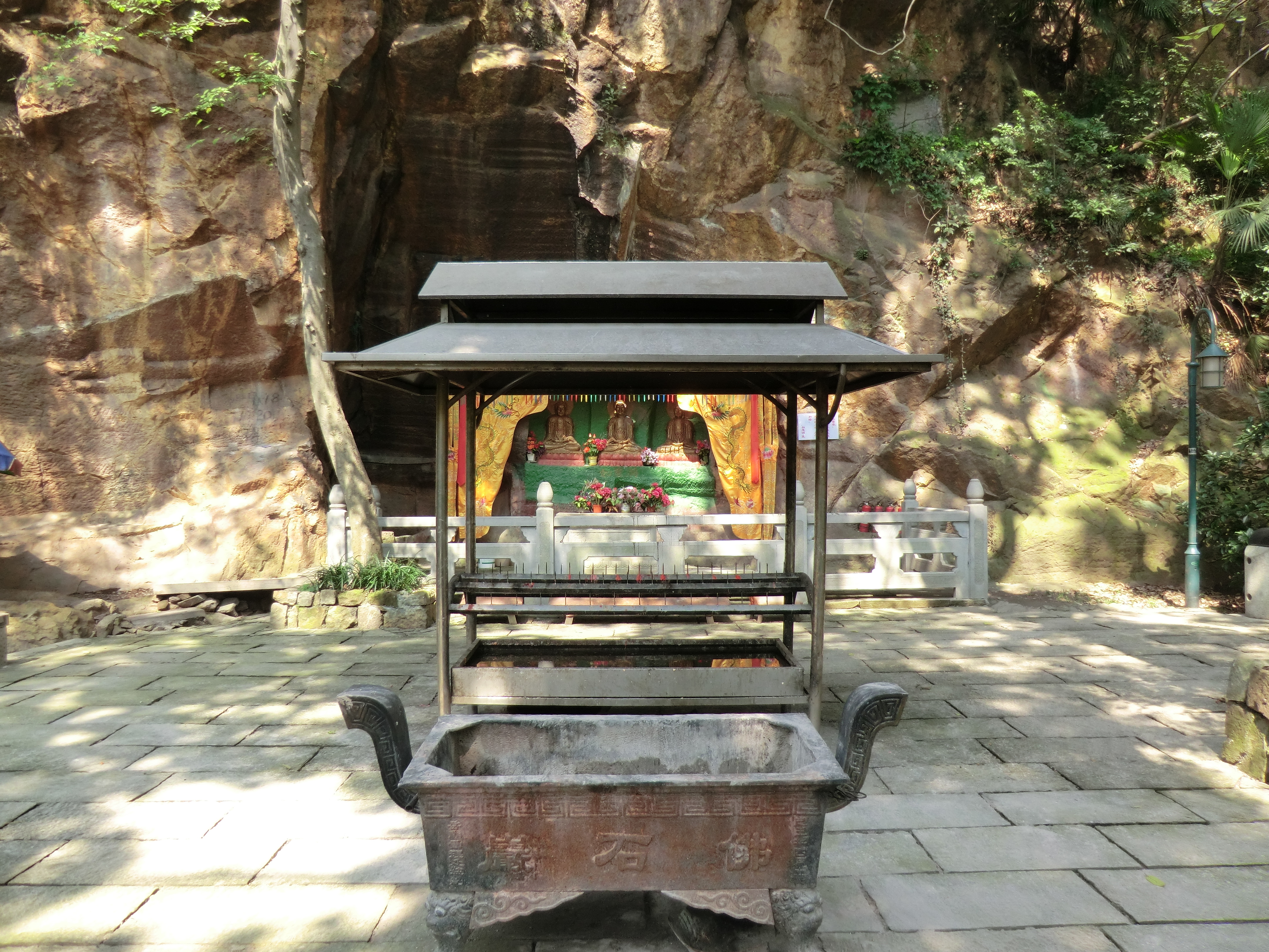 さらにしばらく行くと、「如意洞」がありました。ここにも、石に彫られた仏様が祀られてましたが、私の他に誰もおりません。どうして人気がないのか、紫雲洞にはあった茶室がこちらには無いからなのか、紫雲洞よりも高い位置にあってかなり登らないといけないからなのか、色々と考えましたが、よく分かりません。ここには興味深い表示があって、そこには「仏祖の面前にお金を投げてはいけません。ただ真心をこめて仏を拝むだけで、父母に孝行を尽くし、夫婦は和睦となります。」と書いてありました。うーん、今度は儒教かあ。見事なまでに「三教(儒仏道)一致」の宗教空間です。 ここを抜けたら(すごく急な石段を下りたら)、岳廟(宋代の英雄・岳飛を祀った廟)まですぐです。この後、西湖の孤山公園・白堤を抜け、湖畔のレストランで昼食を取り、平地を歩いて帰りました。全行程3時間ほどでけっこう体にこたえました。我が恩師は、80歳を過ぎてなお毎日3時間は散歩しておられるとのことで、とてもその境地には到達できそうもありませんが、これからも細々と散歩・山歩きは続けていきたいと思います。
