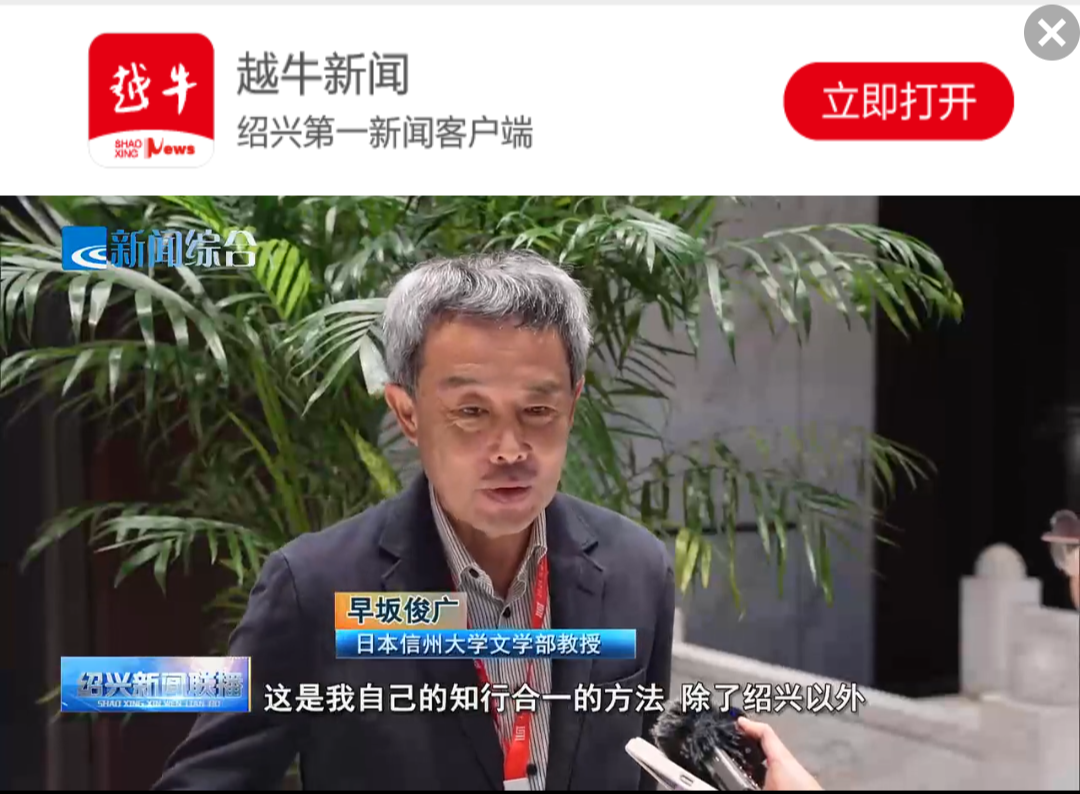そのような岡田先生とのご縁を作ってくださったのが、浙江省社会科学院の銭明先生(現在は浙江省稽山陽明学研究院副院長)でした。信州大学に移ってからも、中国で現地調査を行うたびに、銭明先生にはお世話になりました。今回の催しでは、福岡女学院大学名誉教授の難波征男先生が岡田先生との思い出を語られ、私はここ20年ほどの陽明学遺跡考察(浙江省、江西省、安徽省、江蘇省)について話をさせてもらいました。話し終わって頭が真っ白な状態の時に、現地のメディアの方から取材を受け、ぐだぐだのインタビューとなってしまいました。特に「知行合一」の発音を間違えたことがすごく気になっていましたが、放送(上のリンク)を確認すると、正しくなっていました。たぶんAIさんが直してくださったのだと思います。恥を忍んでリンクを貼っておきますが、いつリンクが切れるか分からないので、臆面もなくスクショ画面も載せておきます。