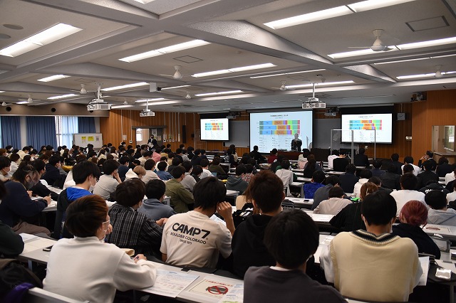 本日の講義テーマとして掲げた「三ガク都」とは、松本らしさを象徴する言葉(岳都・楽都・学都)であり、現況から更にバージョンアップしてシンカ(進化・深化)させていき、その真価を発揮させることにより、「自由で開放的で多様性あふれるまち」を目指すと、今後に向けた熱い思いを学生に語り掛けていました。