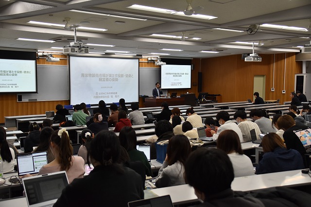 2025年12月10日、2025年度「経営者と企業」第6回の講義として、株式会社R&Cながの青果 代表取締役社長 堀 陽介氏から「青果物卸売市場が果たす役割・使命と経営者の姿勢」と題して講義が行われました。
