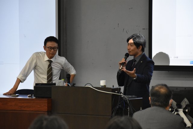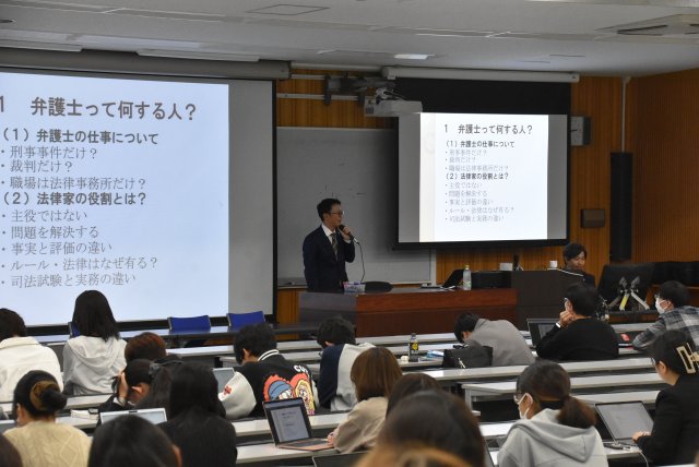 池田 大介先生、國松 崇先生(池田・國松法律事務所)の講義が行われました 2025. 10.20 現代法務Ⅰ 2025年10月20日、2025年度「現代法務Ⅰ」の第4回として、池田・國松法律事務所の池田 大介氏、國松 崇氏の講義が行われました。 池田・國松法律事務所 池田 大介氏(左)國松 崇氏(右) 講義風景