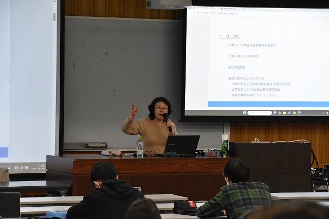 木下 潮音先生(第一芙蓉法律事務所)の講義が行われました 2025. 11.05 現代法務Ⅰ 2025年11月5日、2025年度「現代法務Ⅰ」の第6回として、第一芙蓉法律事務所の木下 潮音氏の講義が行われました。 第一芙蓉法律事務所 木下 潮音氏 講義風景