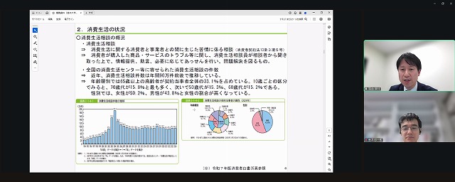 落合 英紀先生(消費者庁) の講義が行われました 2025. 11.17 現代法務Ⅰ 2025年11月17日、2025年度「現代法務Ⅰ」の第8回として、消費者庁取引デジタルプラットフォーム消費者保護室長の落合 英紀氏の講義がオンラインで行われました。 消費者庁 取引デジタルプラットフォーム消費者保護室長 落合 英紀氏 講義風景