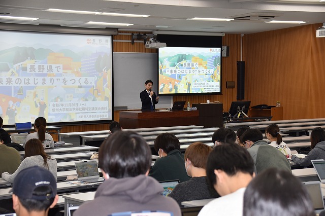 2025年11月26日、2025年度「経営者と企業」第5回の講義として、長野県人事委員会事務局及びミネベアミツミ株式会社による就職特別講演会と就職活動を終えた経法学部4年生による内定者報告会が行われました。