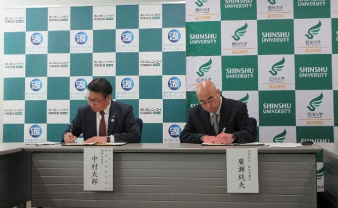 あいおいニッセイ同和損害保険株式会社長野支店長(左の写真左)と経法学部・廣瀬純夫学部長(左の写真右)が協定書に署名しました。