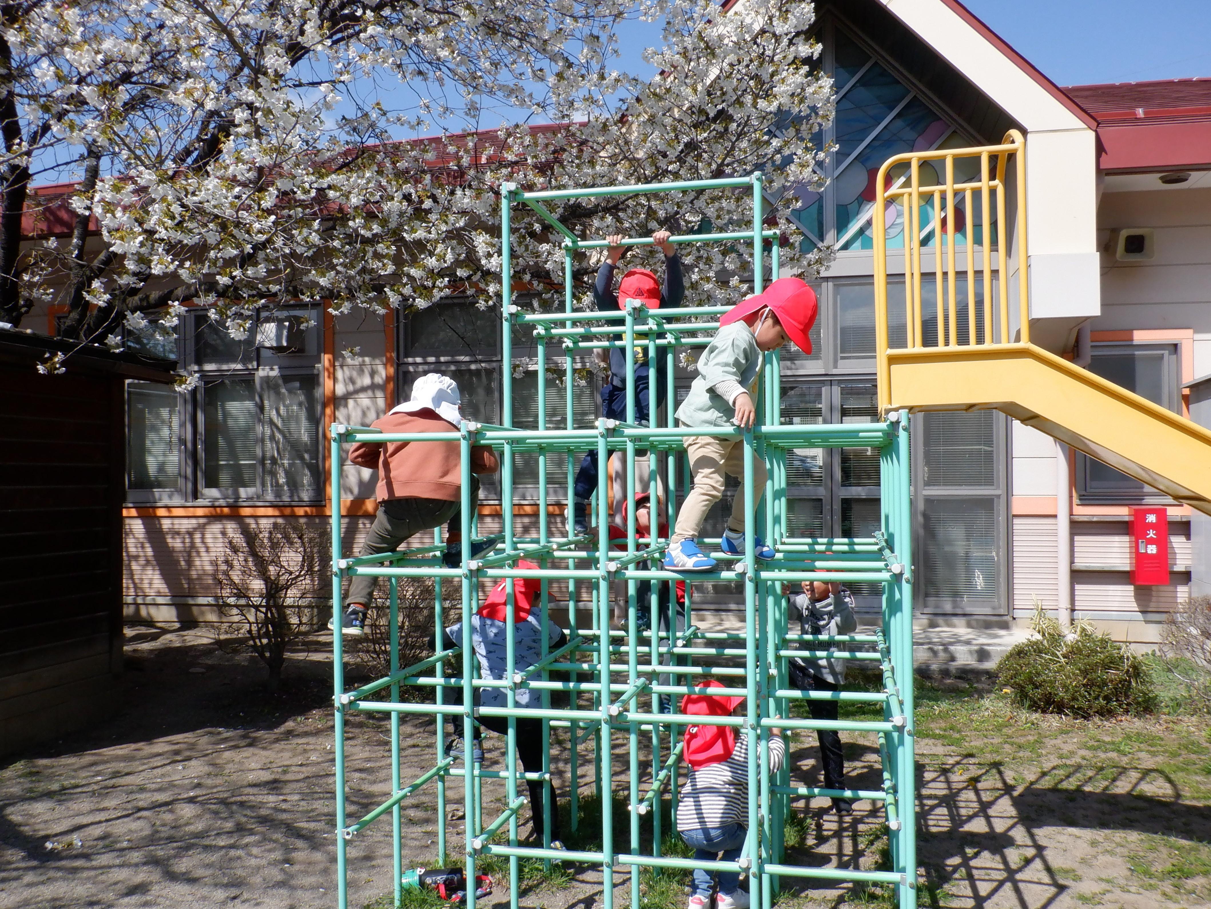 年中・年長さんに交じってジャングルジムにもすいすい上り「おーい!」。ジャングルジムのてっぺんは,桜に手が届きそうです。