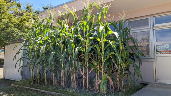5月にみんなで種をまいたポップコーン。夏休み前にからこんなに大きく成長しましたよ。