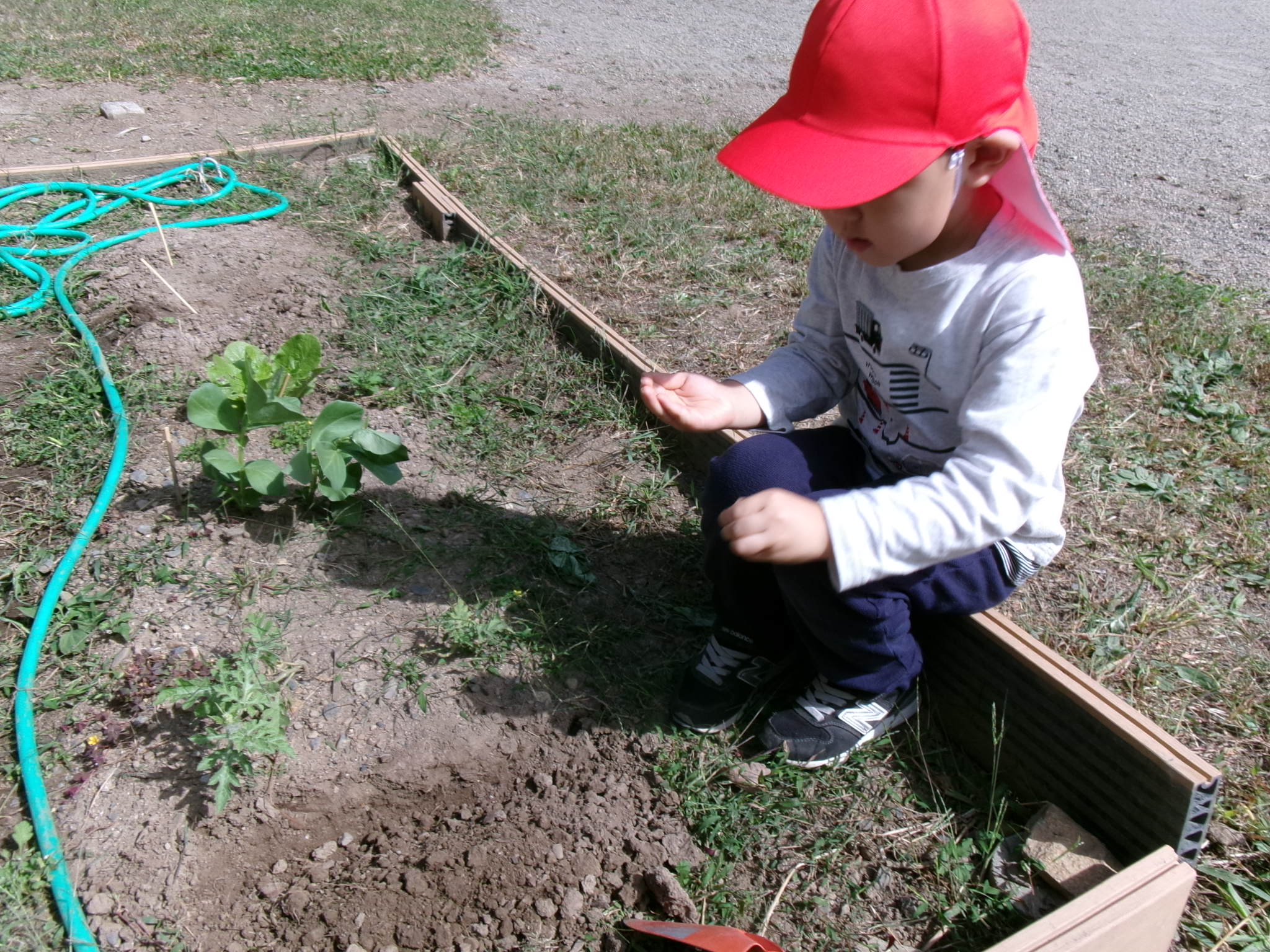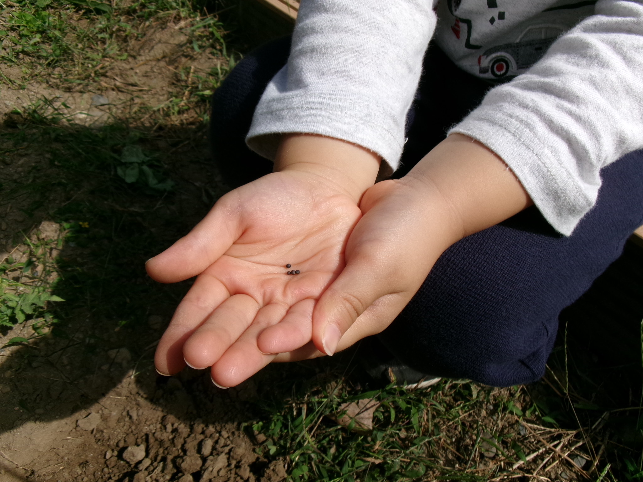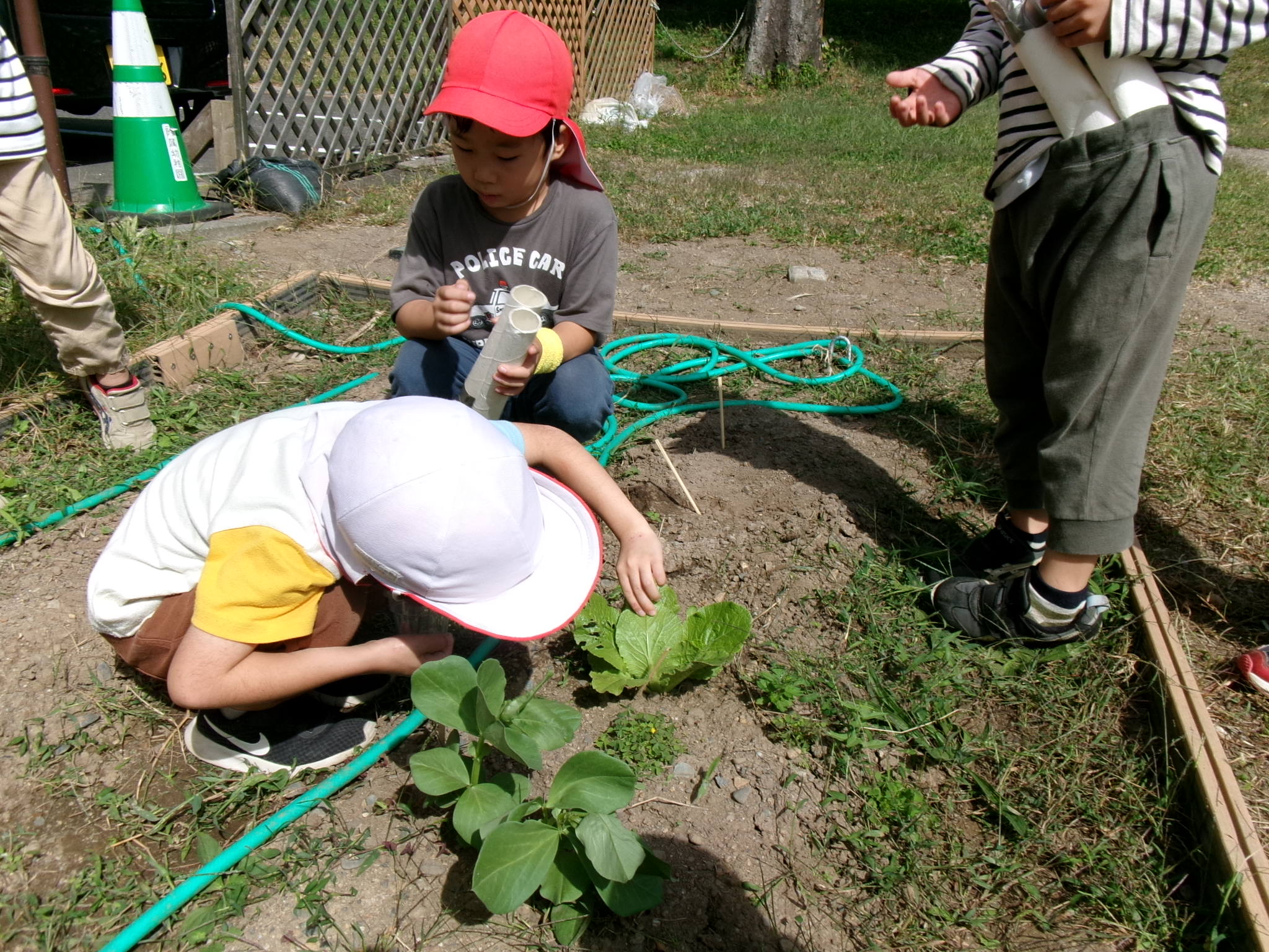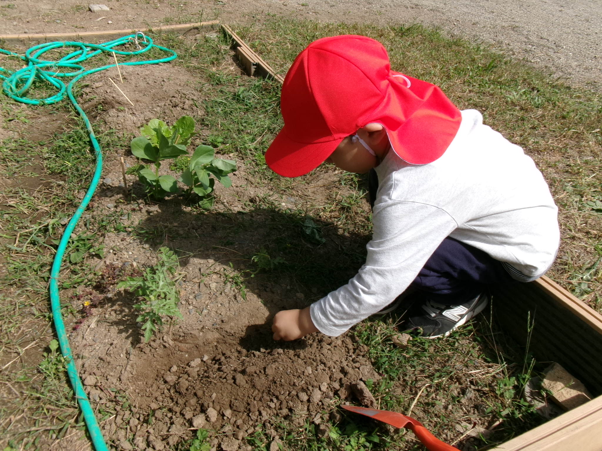 今日は、「チンゲンサイ」の種を持ってきた年少さんが、「これ植えるの!」と畑へやってきました。