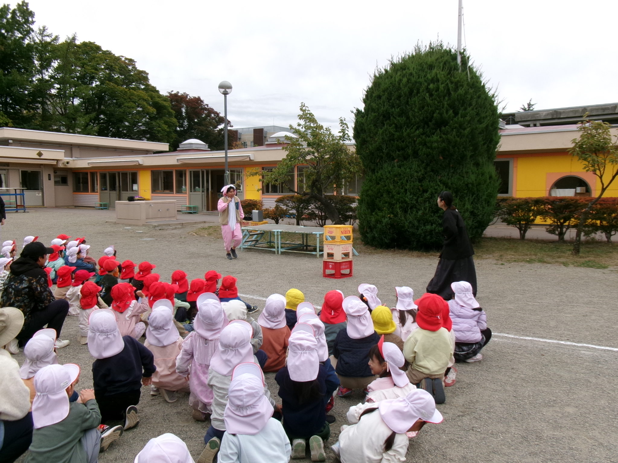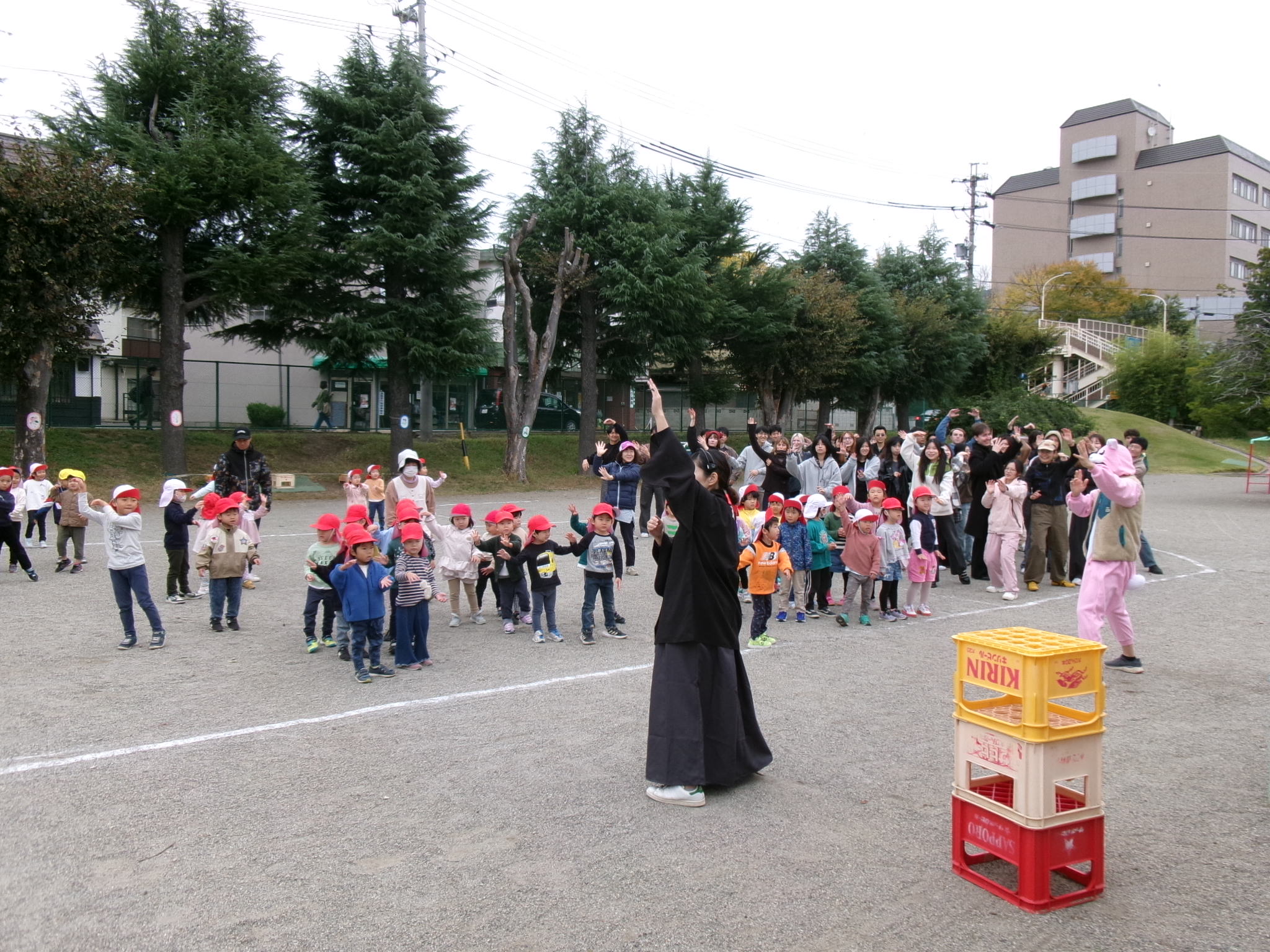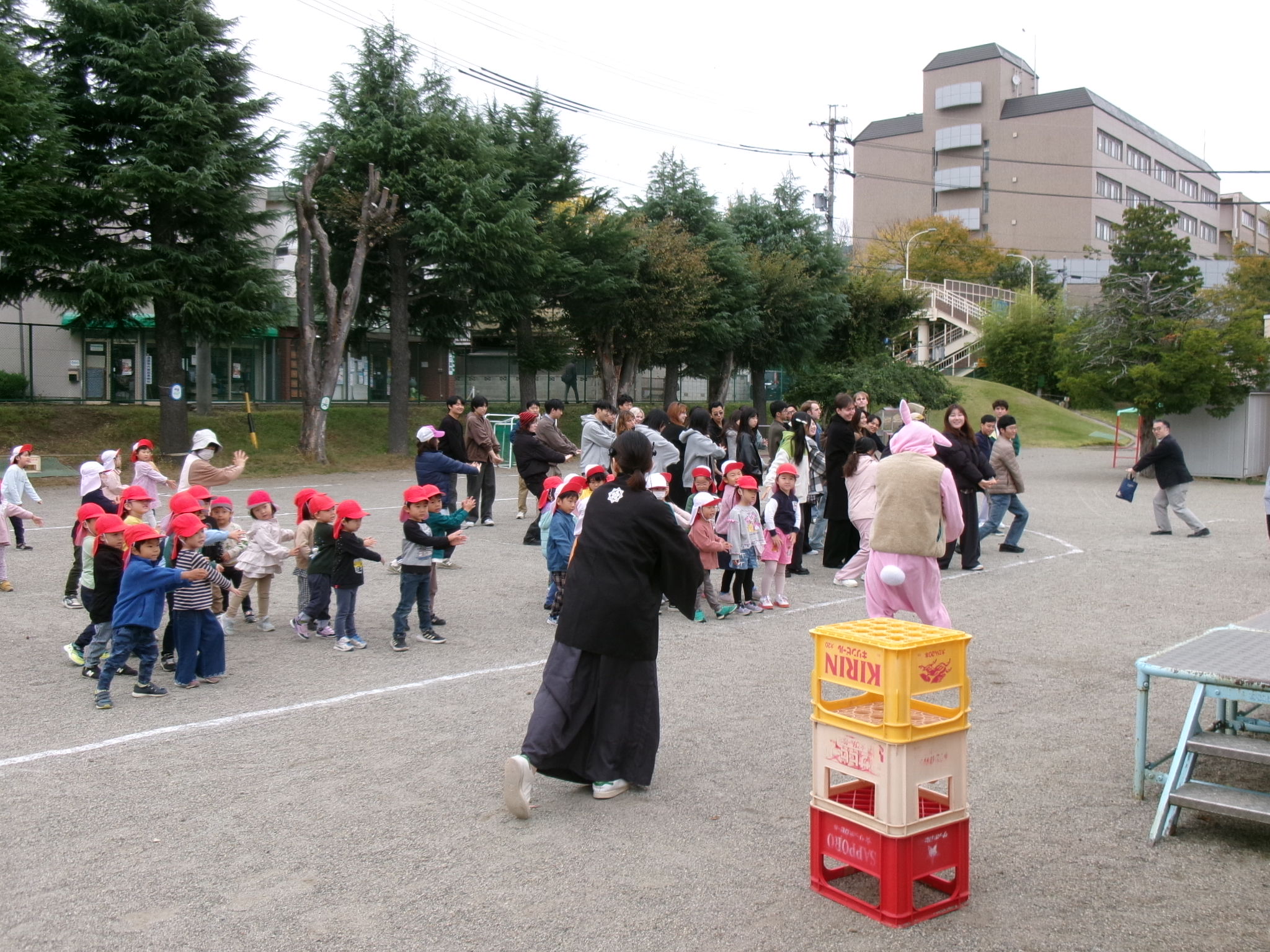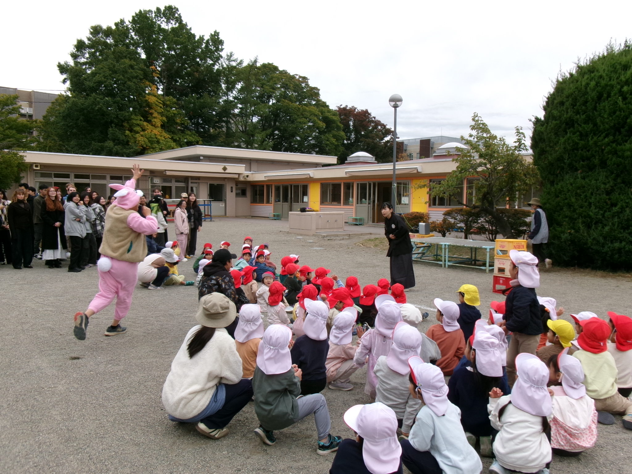 園庭に出て、みんなで待っていると、どこからか怪しげな人が...。