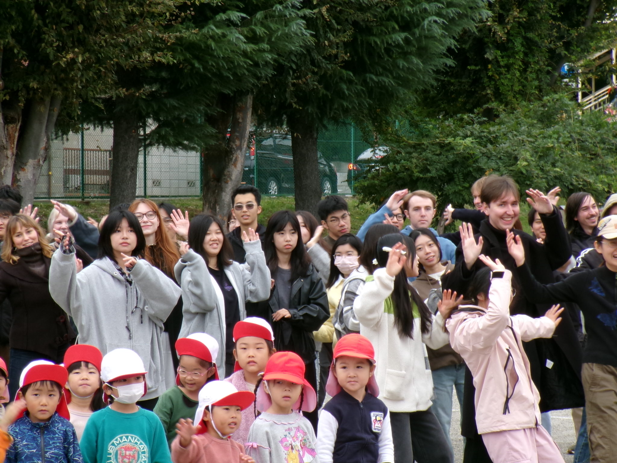 今日は、国際共修で、信州大学の留学生もやってきていたので、一緒に昆虫のポーズをとってみます。