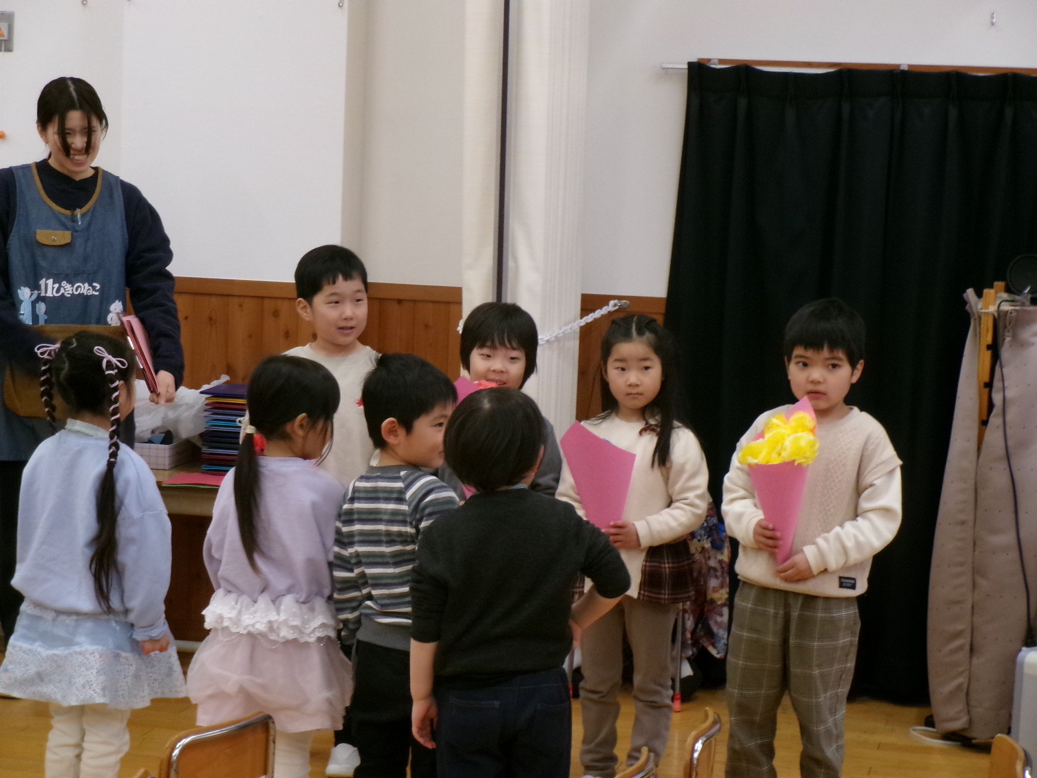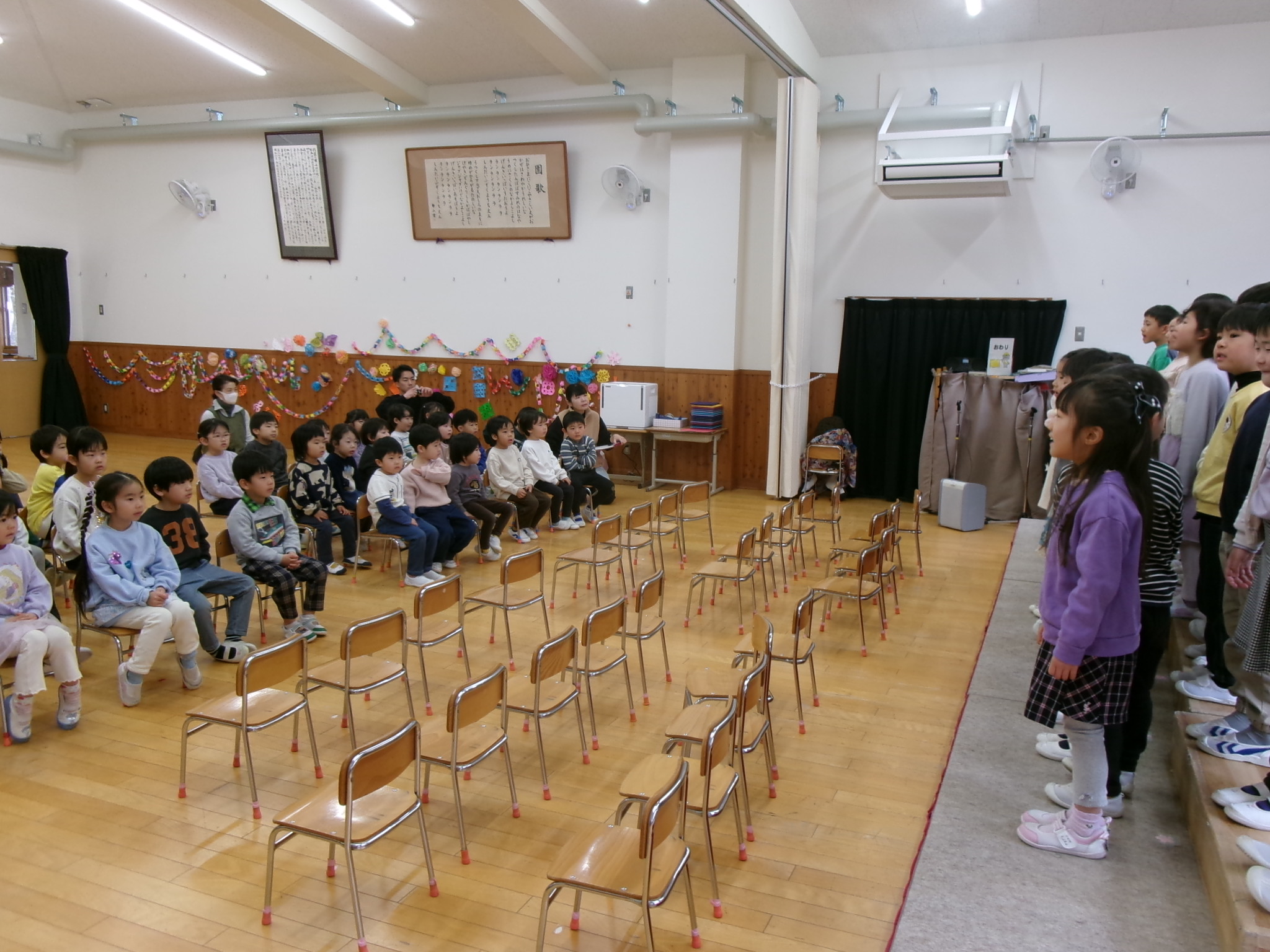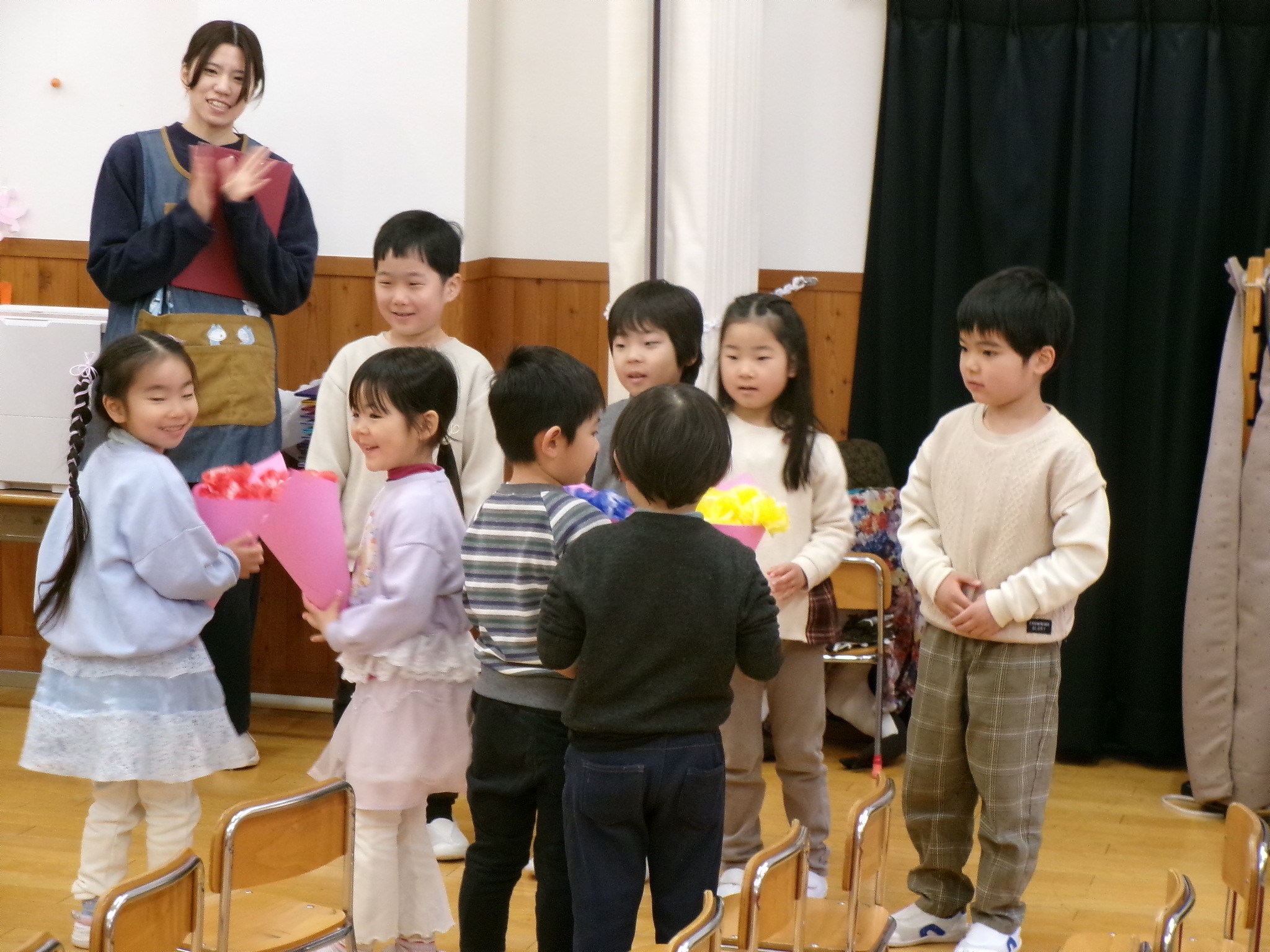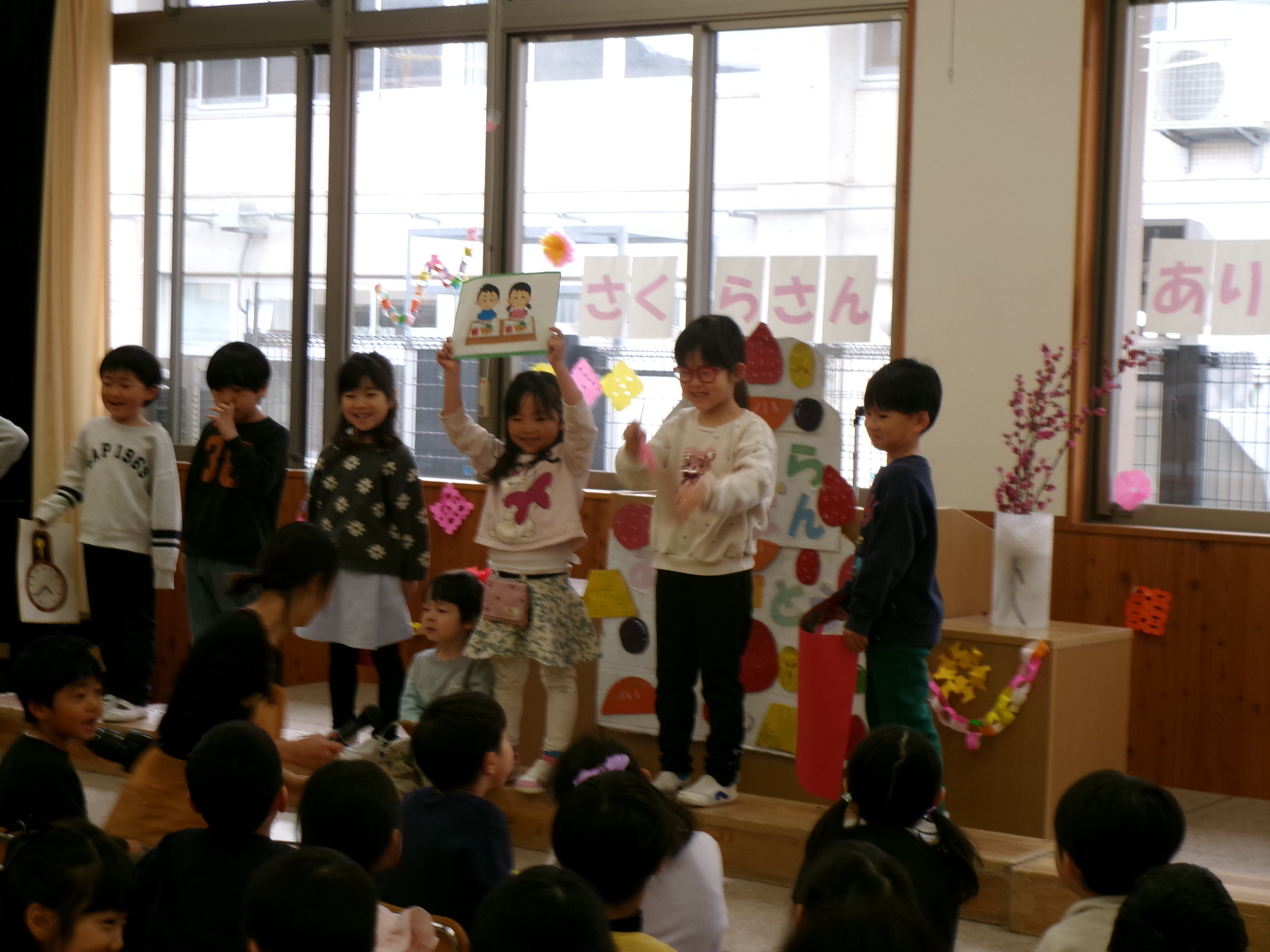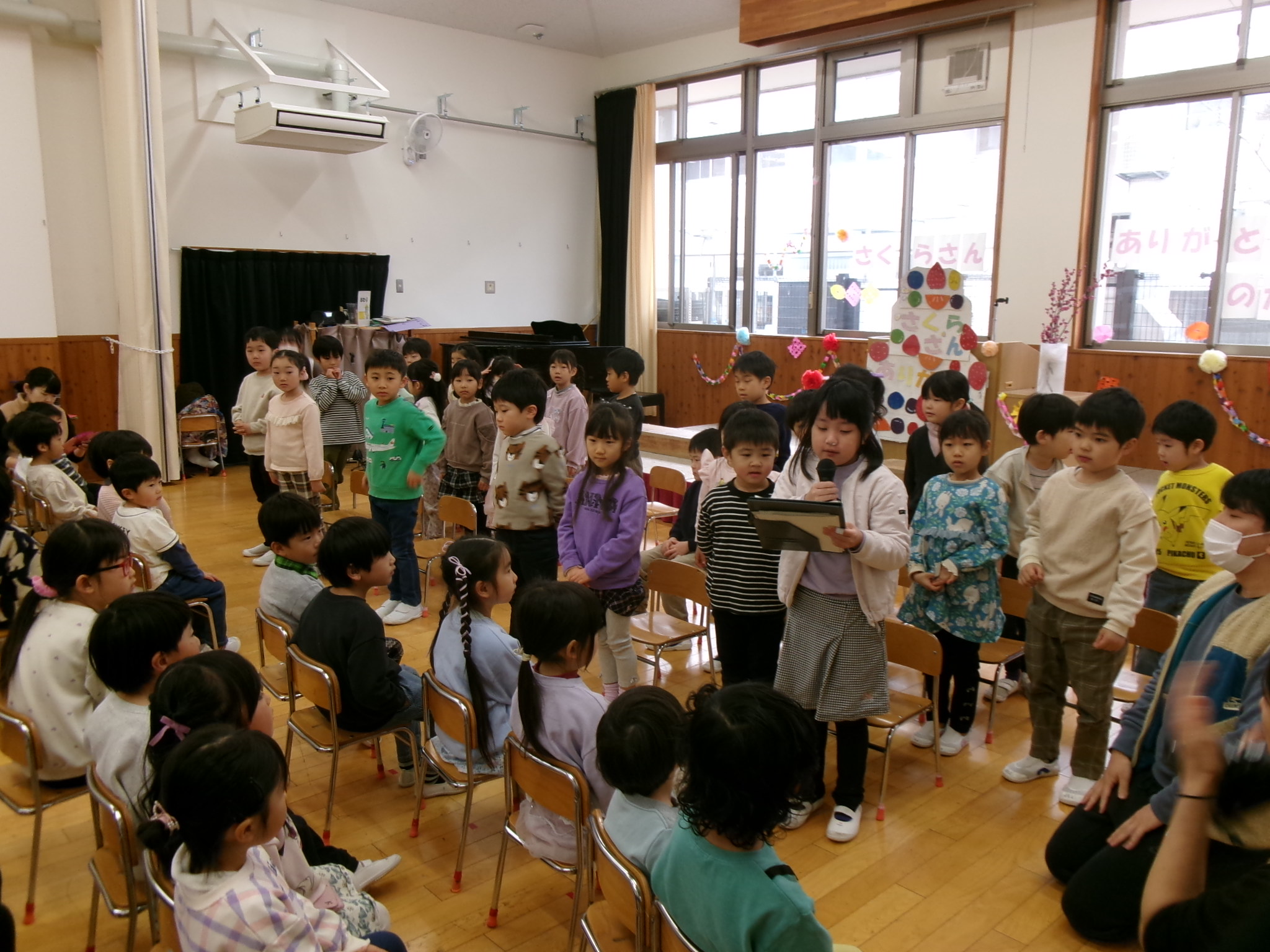「今日は、みんなの力を合わせて、ありがとうの会を成功させることができたね。4月からは、1つずつ学年が上がります。今のさくらさんみたいに、幼稚園のリーダーとして頑張ろうね。」