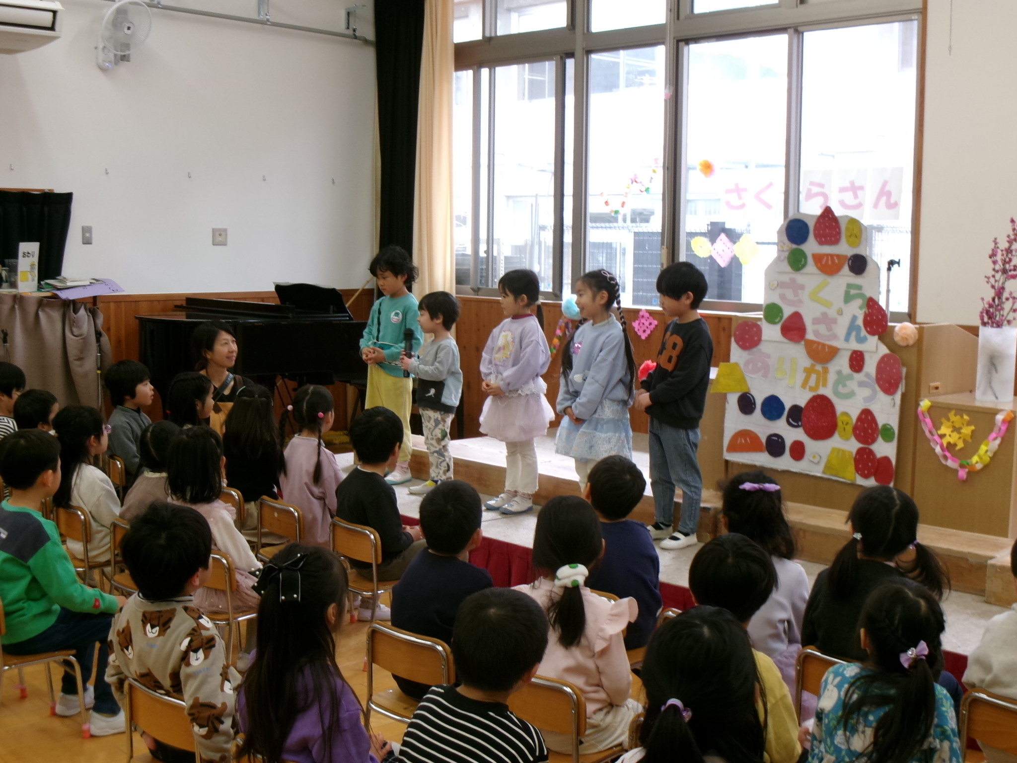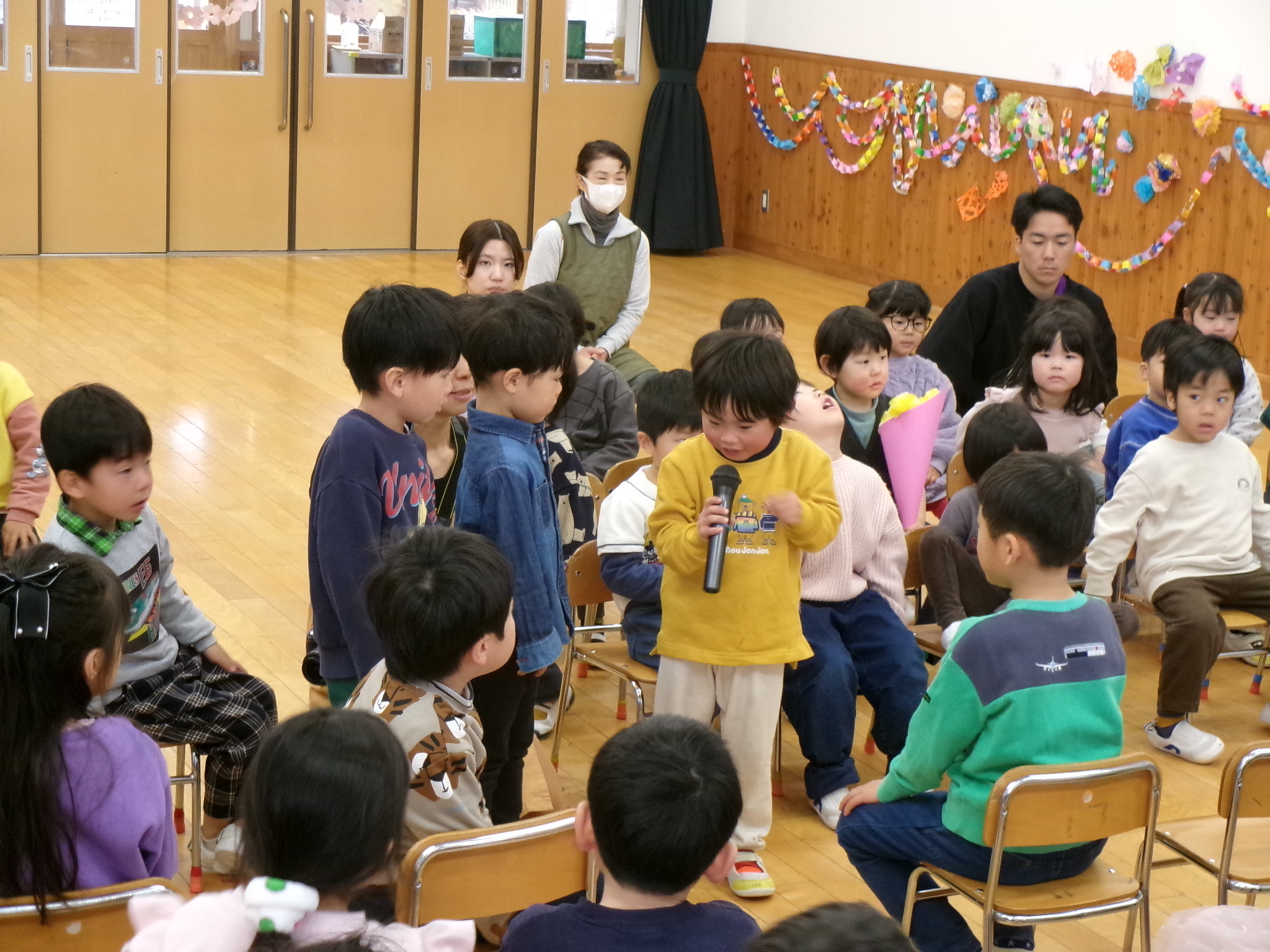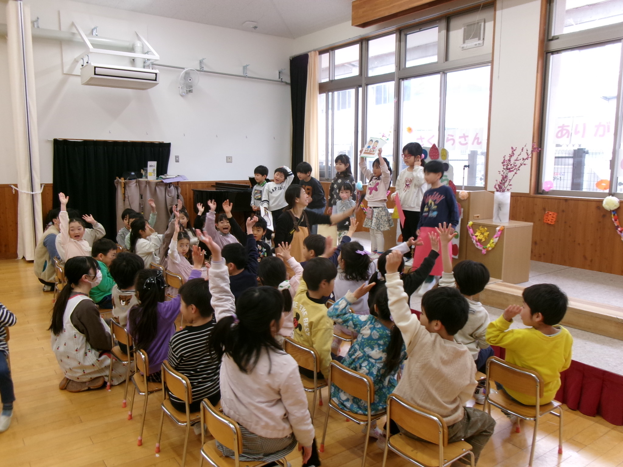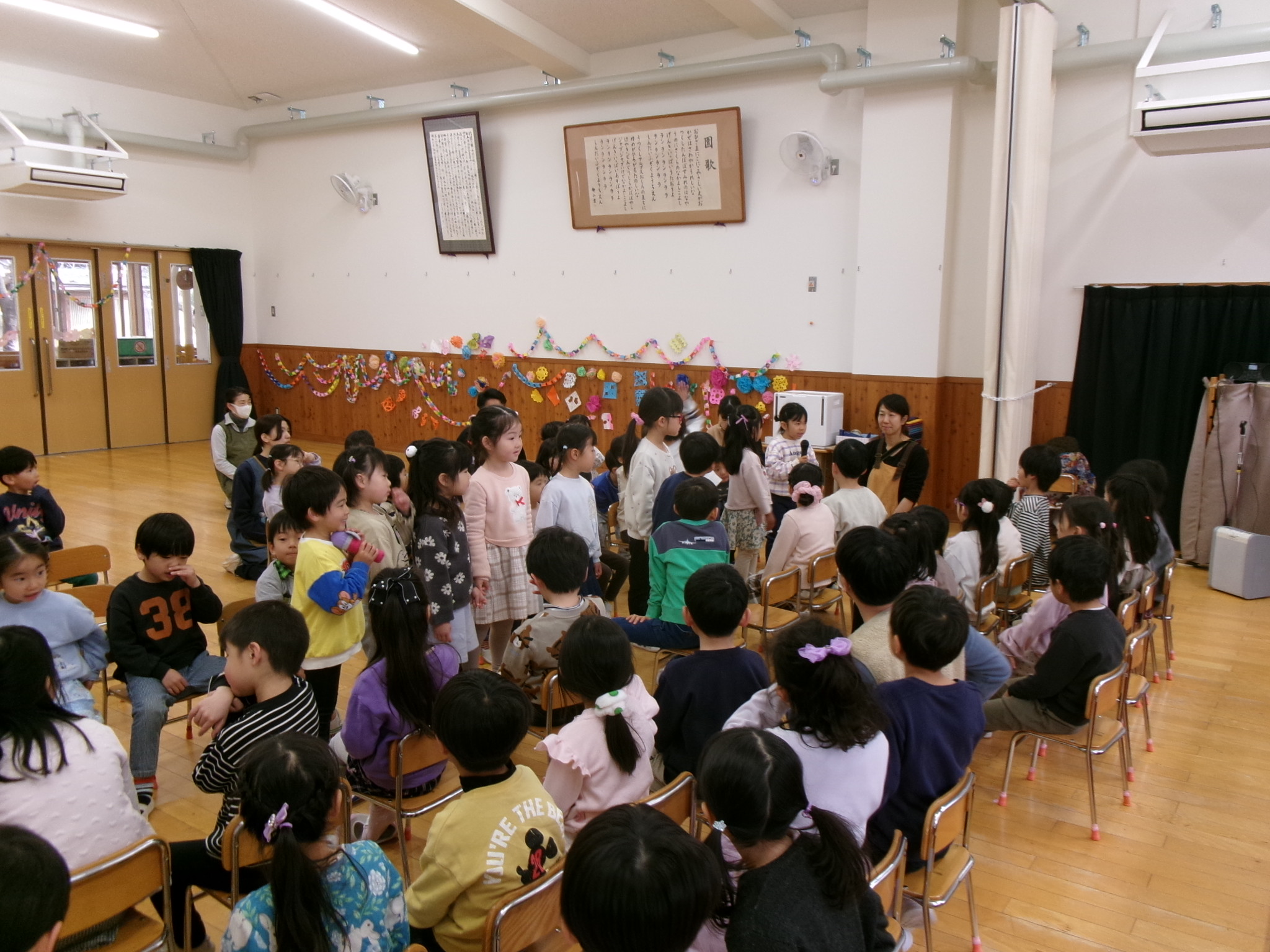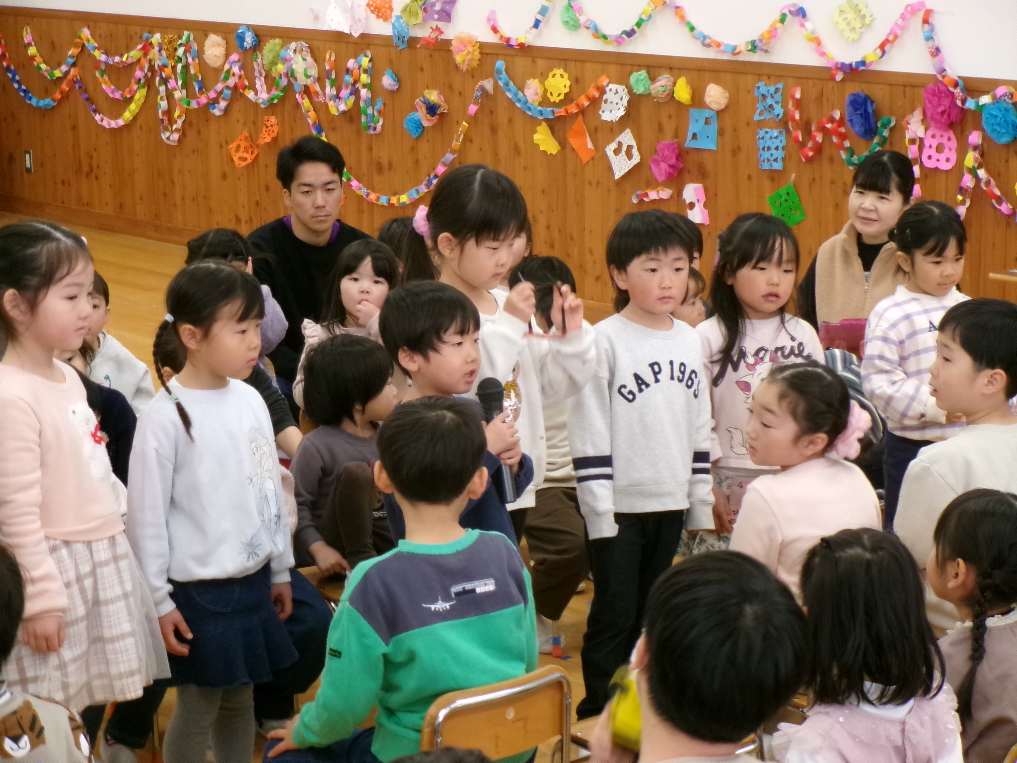 「今日は、みんなの力を合わせて、ありがとうの会を成功させることができたね。4月からは、1つずつ学年が上がります。今のさくらさんみたいに、幼稚園のリーダーとして頑張ろうね。」