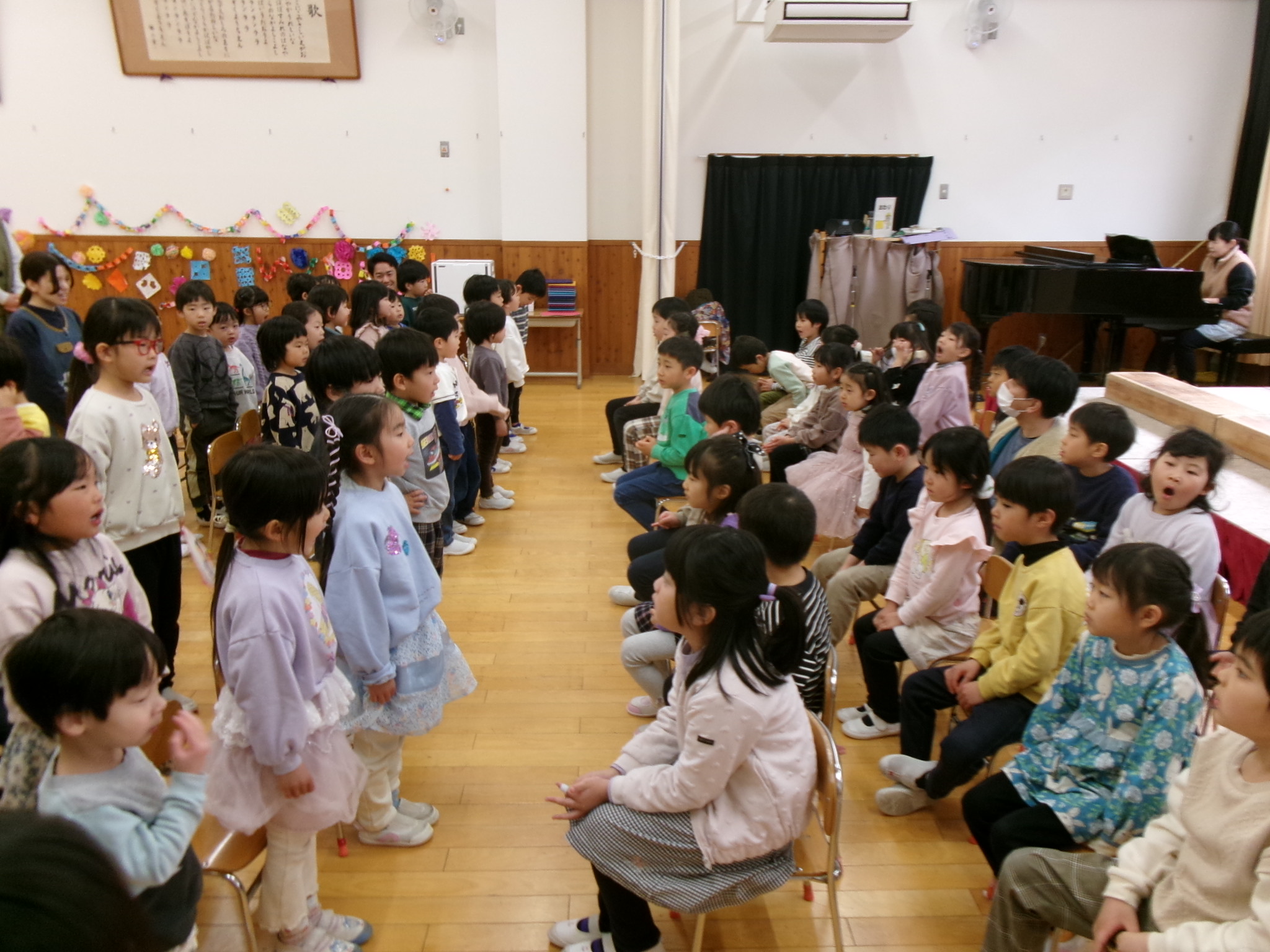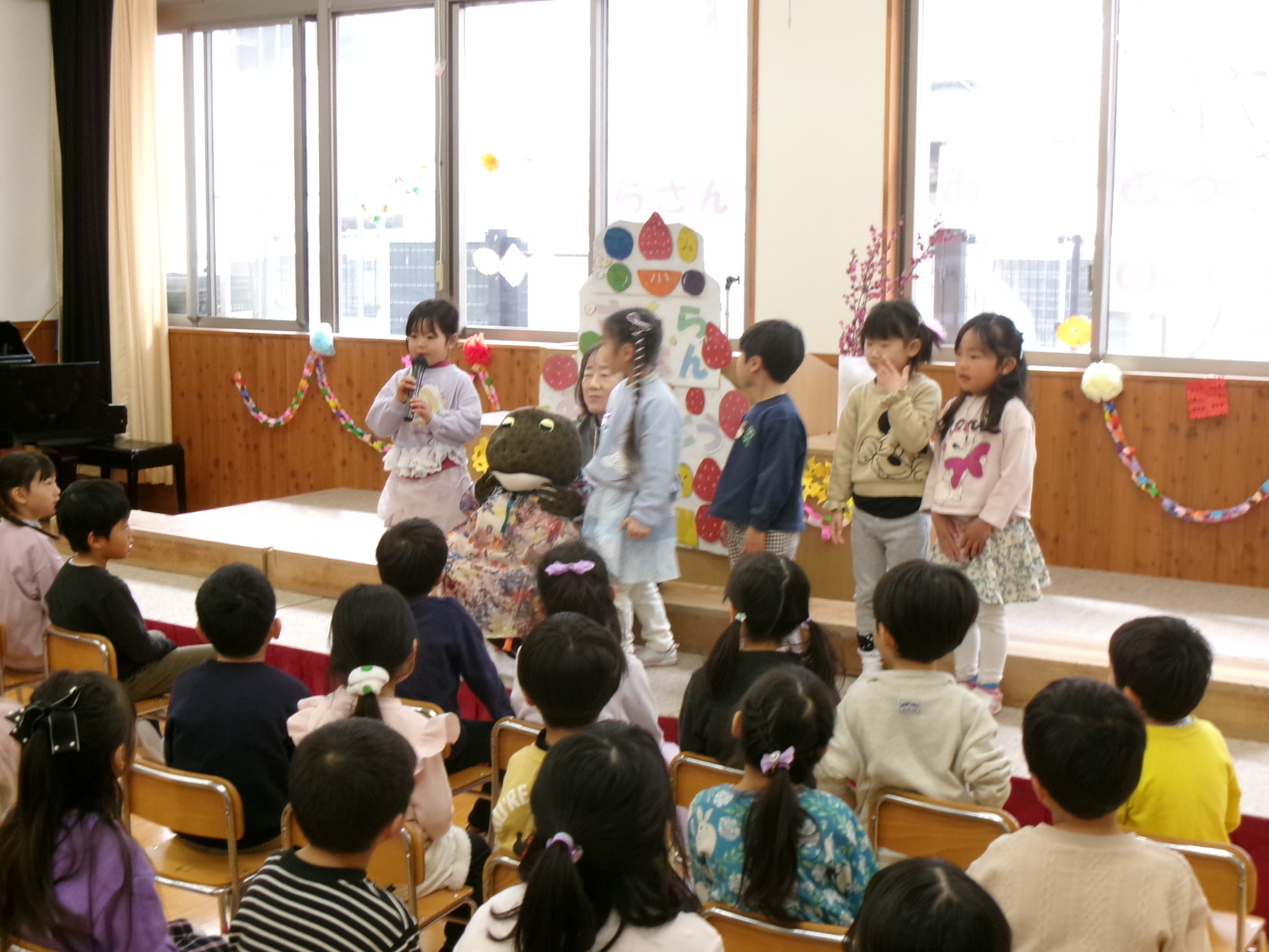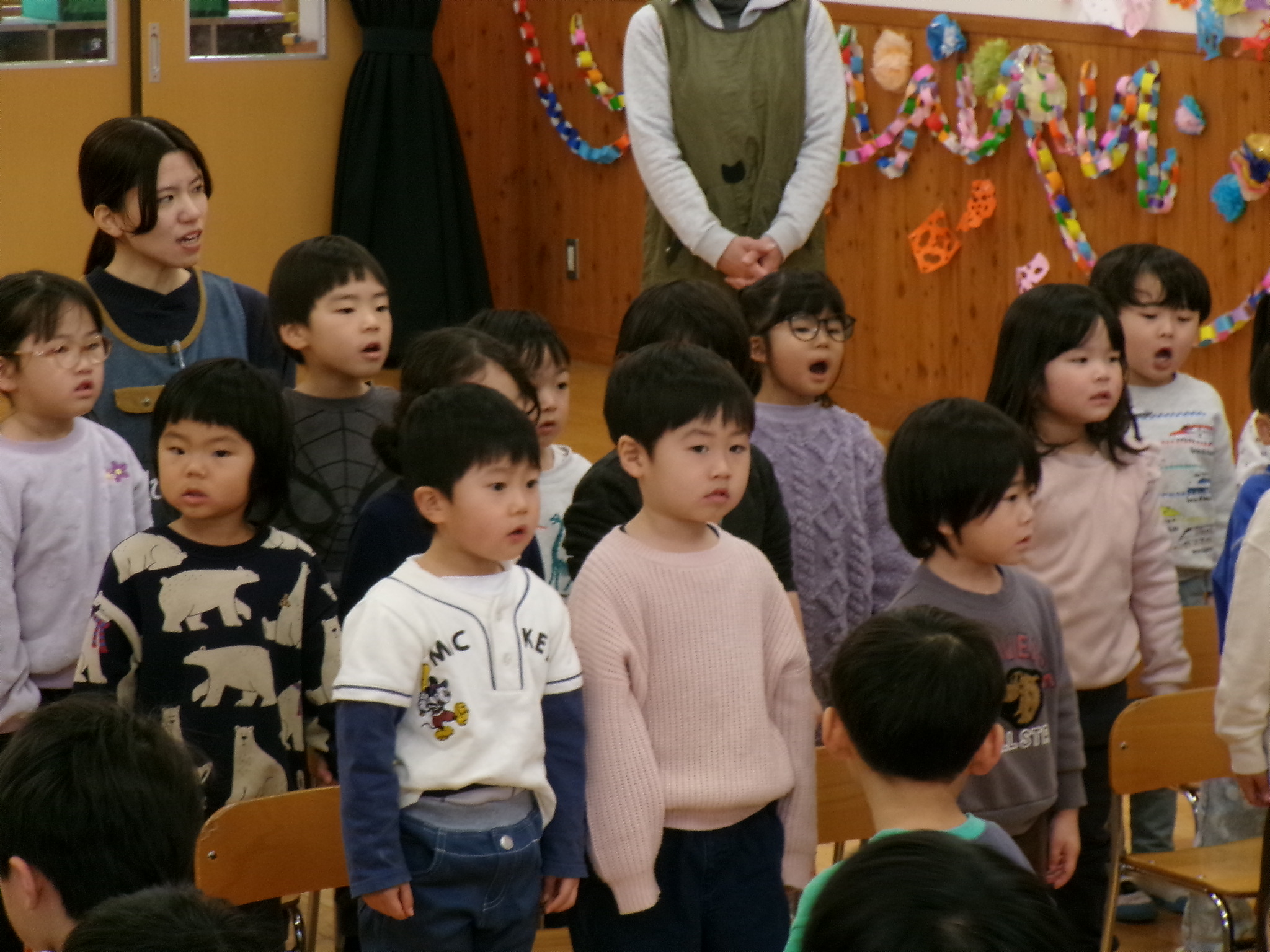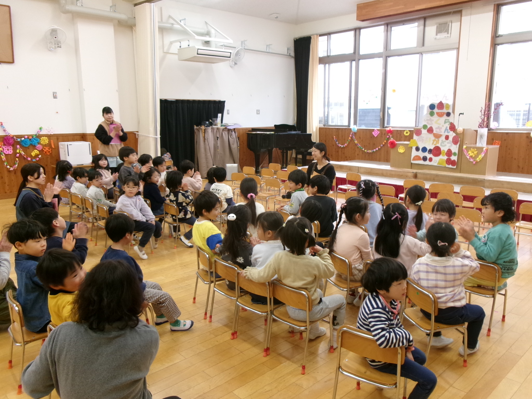 「今日は、みんなの力を合わせて、ありがとうの会を成功させることができたね。4月からは、1つずつ学年が上がります。今のさくらさんみたいに、幼稚園のリーダーとして頑張ろうね。」