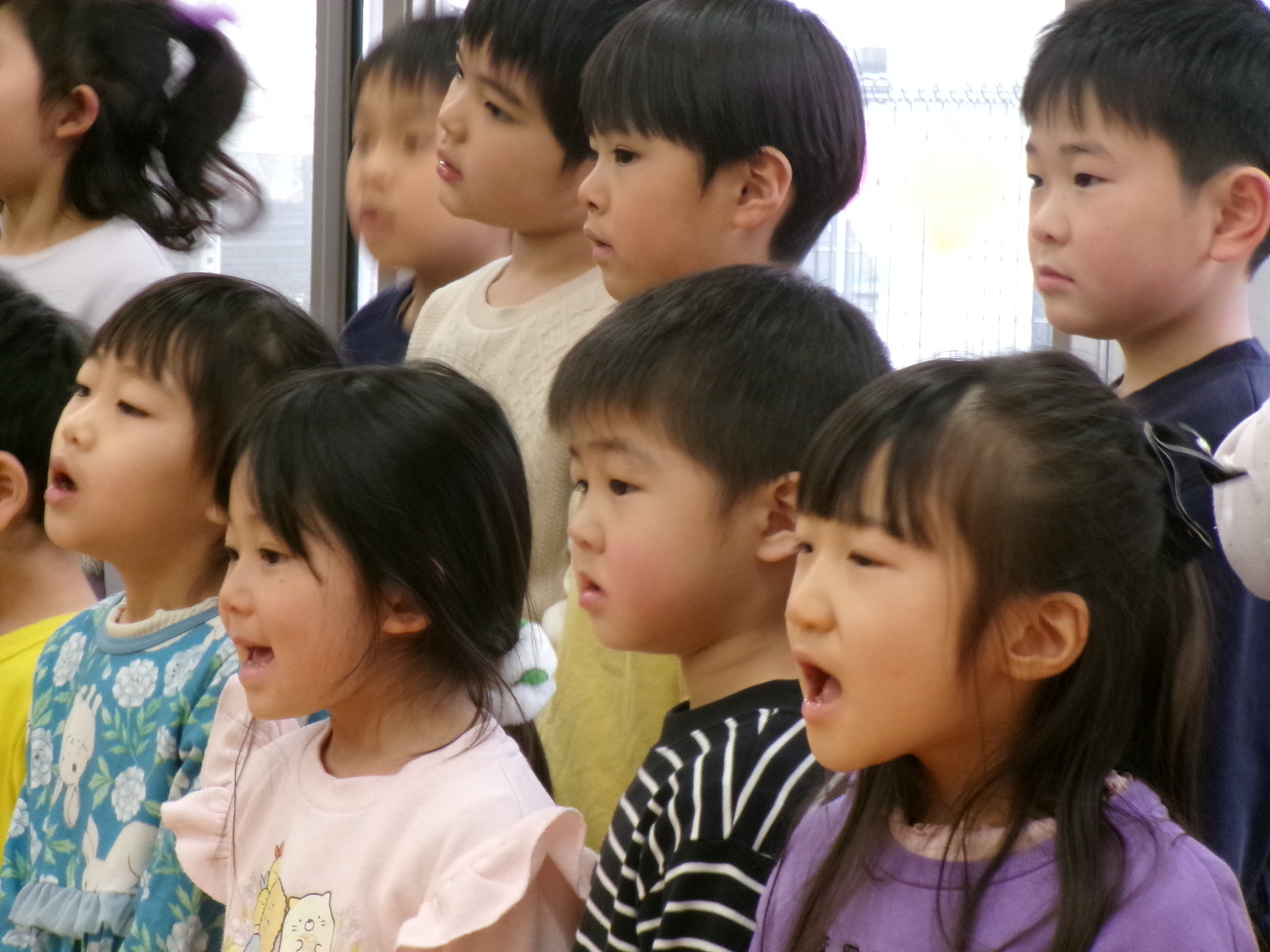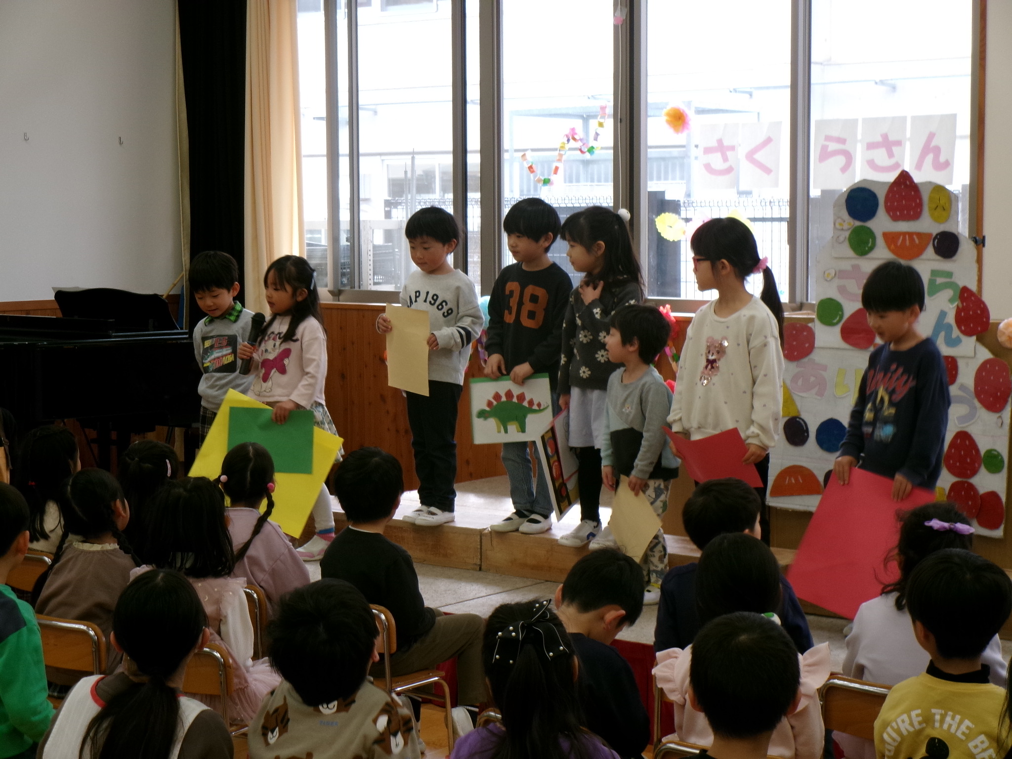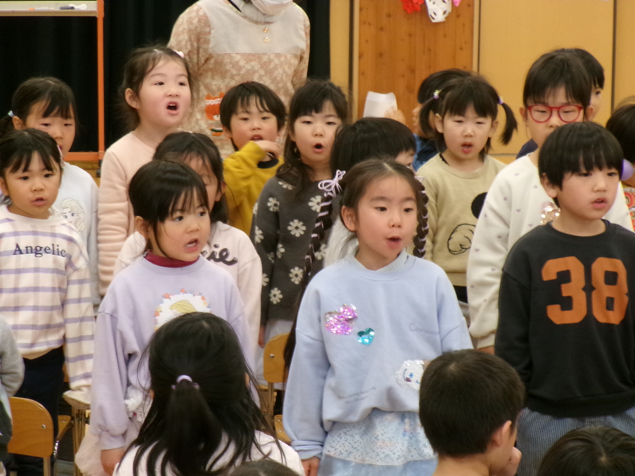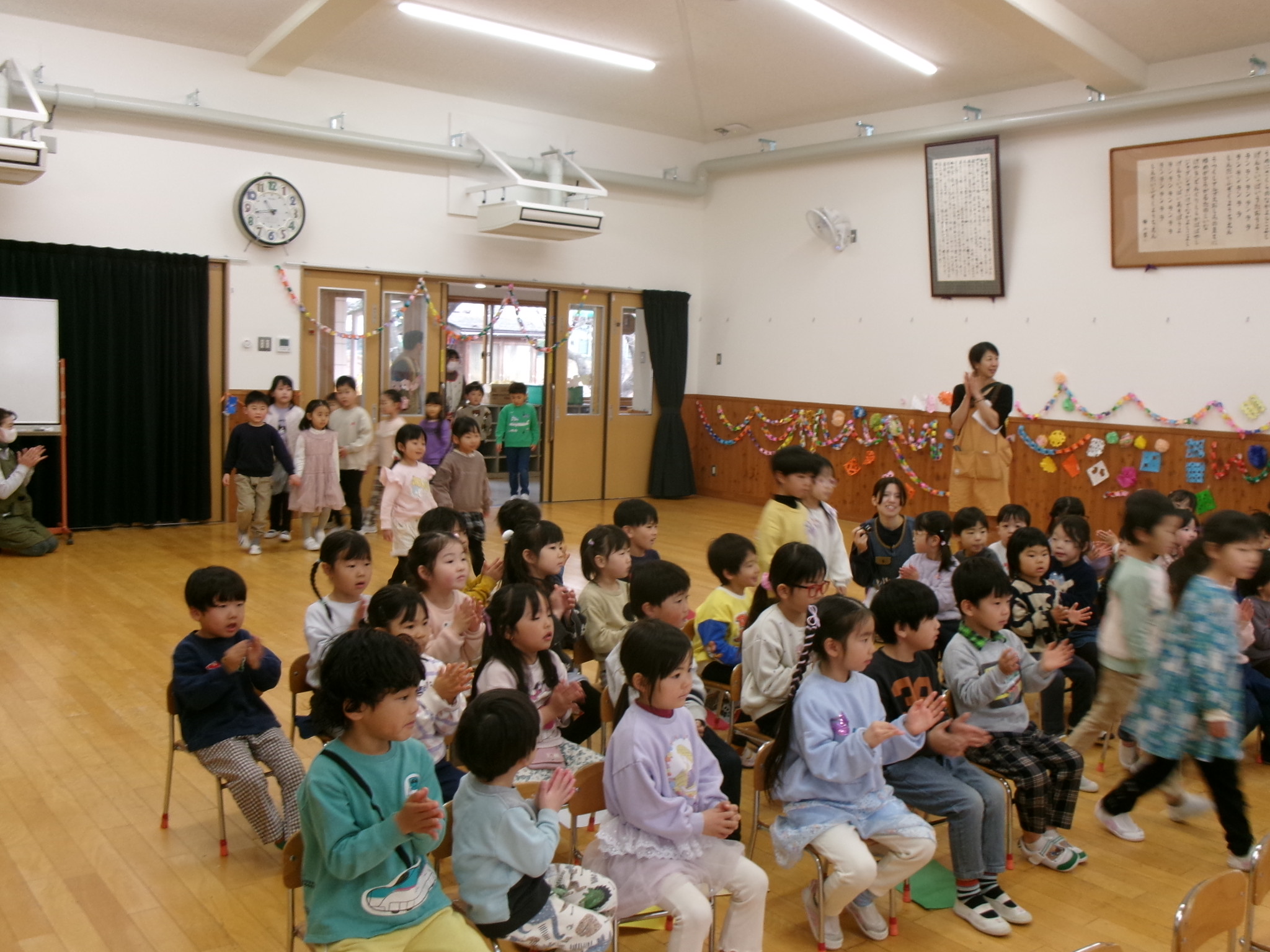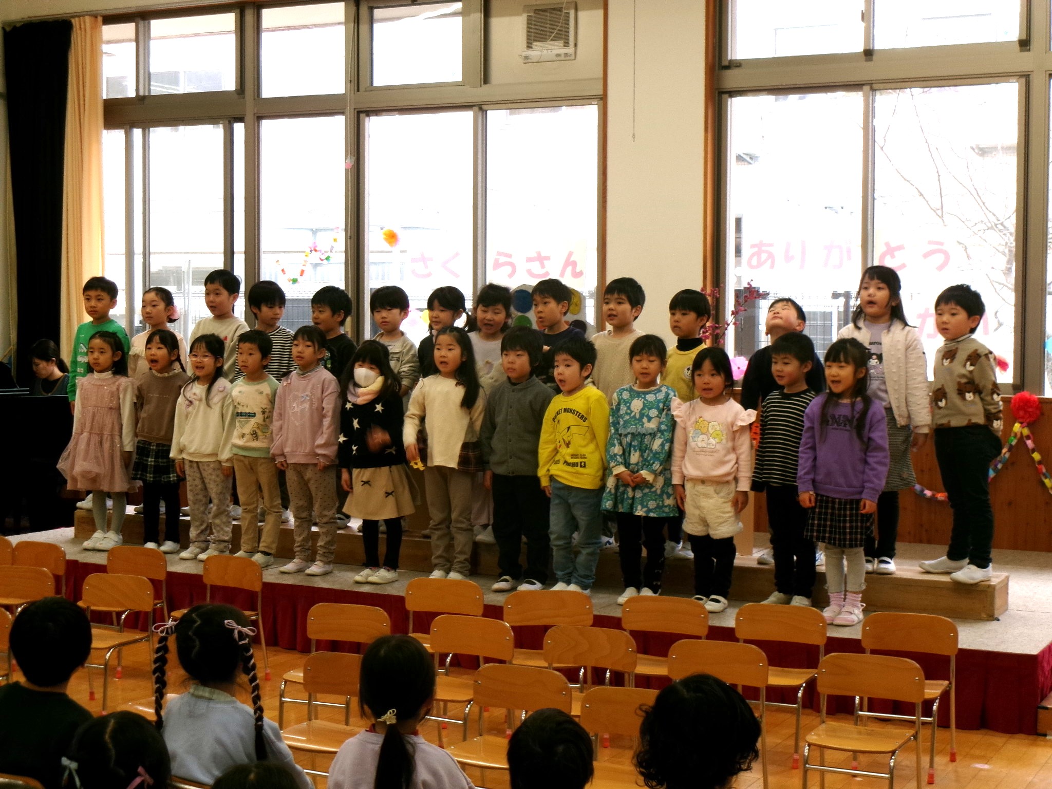 「今日は、みんなの力を合わせて、ありがとうの会を成功させることができたね。4月からは、1つずつ学年が上がります。今のさくらさんみたいに、幼稚園のリーダーとして頑張ろうね。」