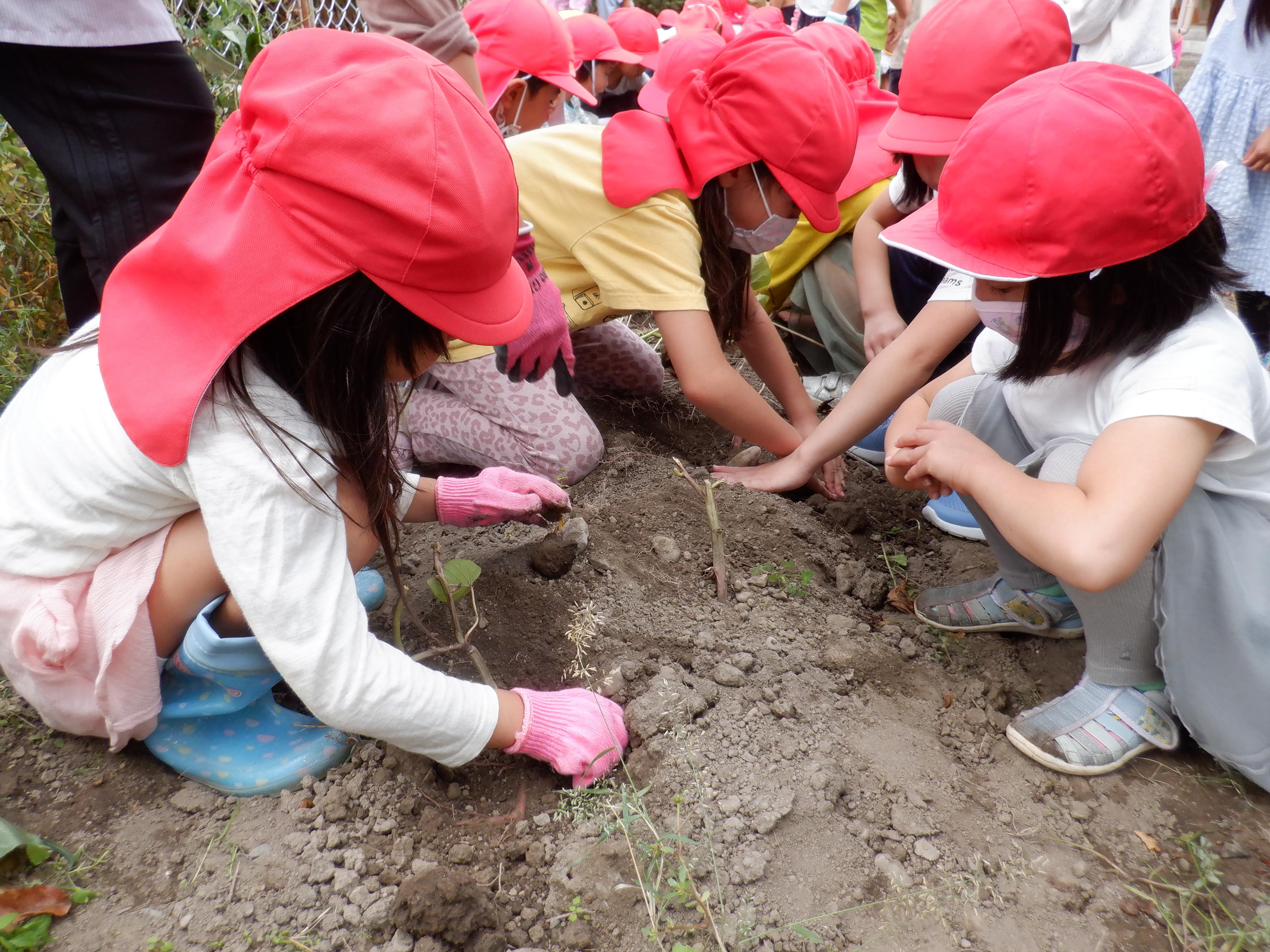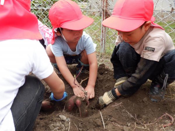 NEWS & TOPICS 2021/10/14 園の様子 おいもほり 10月13日 6月に植えたサツマイモ。土の中で大きくなってきた様子だったので,まず年長・年中とでおいもほりをしました。 みんなでサツマイモのお話を聞いて... おいもどこにあるかな...あ,あった,あった! これは大きそう やったぁ! おいもの他にも,ザクロだったり,幼虫だったり...いろいろなものを収穫できたおいもほりとなりました。 前へ 一覧にもどる 次へ