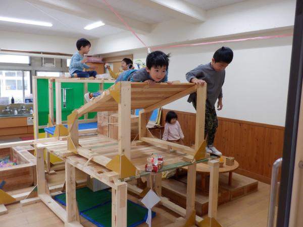 前庭には,子どもたちが金槌で釘をたたくリズミカルな音とともに,屋根裏部屋のある大きなお家ができてきました。