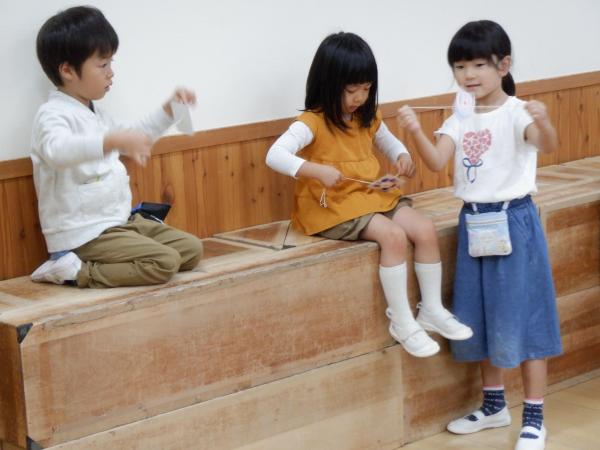 この日のさくら組は、A実習生が担当。みんなで「ぶんぶんゴマ」を作って遊びました。