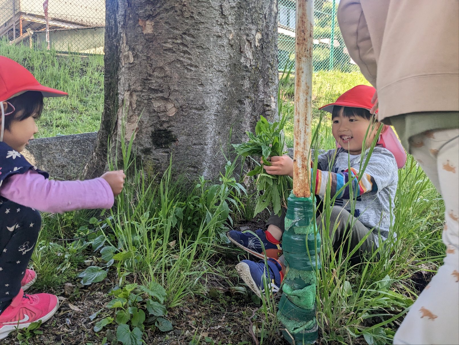 大きくなった草を根元から引っこ抜きます。どうやら野菜の収穫をしているみたいですよ。たくさん収穫した野菜は、この後タイヤのバーベキューコンロで焼いていただきました!