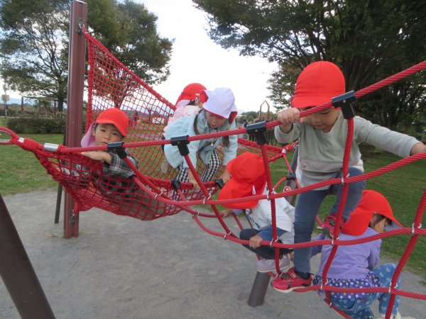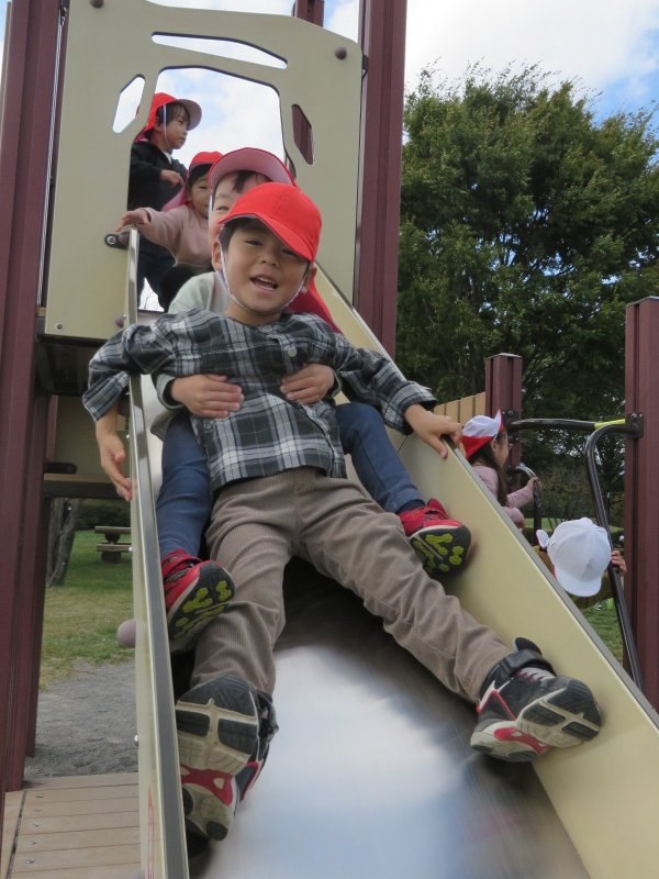 大芝生広場には幼稚園にはないような楽しい遊具がいっぱい!みんな思い思いの遊具で思いっきり楽しみました。