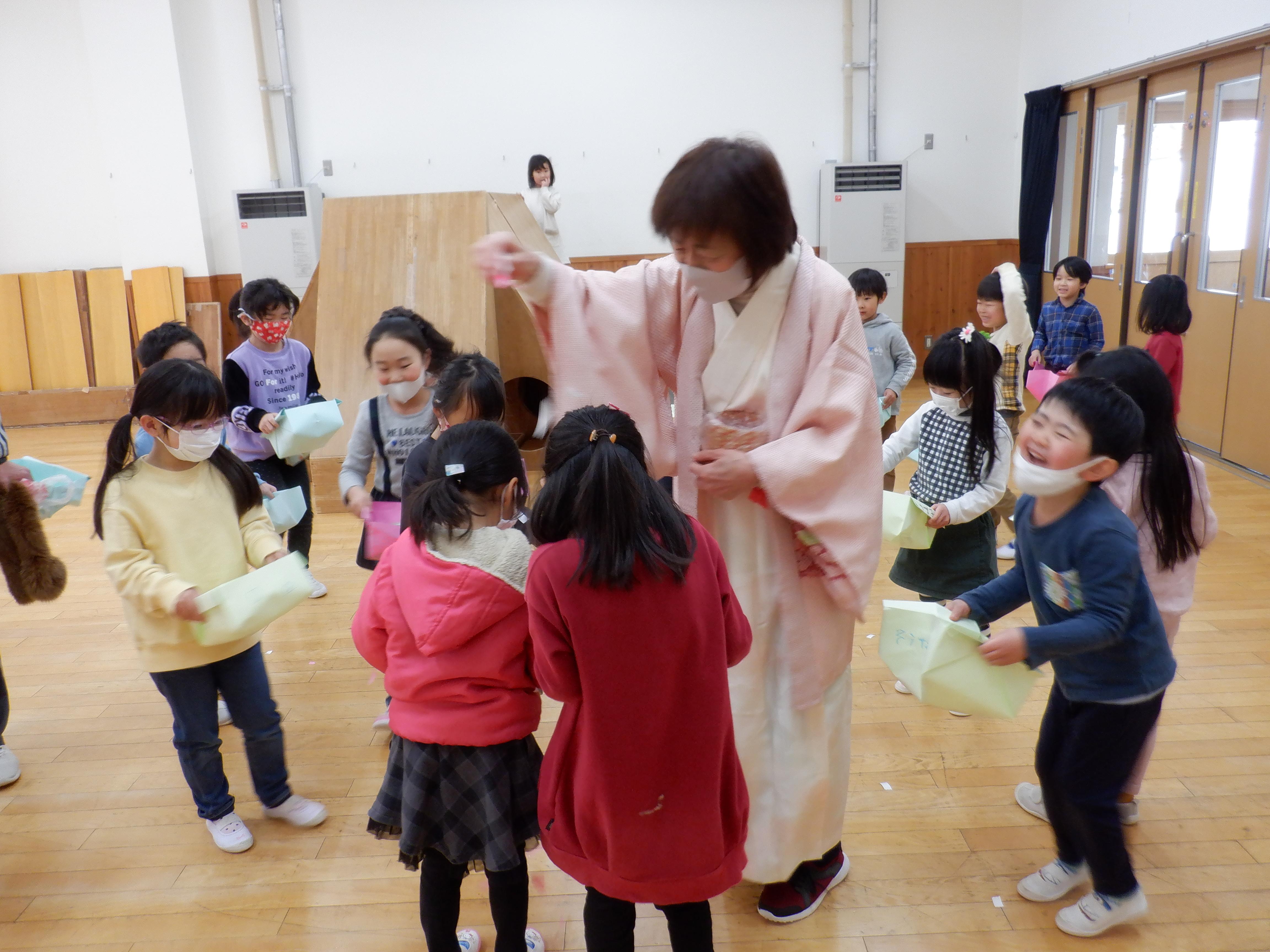 鬼が去った後は、福の神がやってきて「春が来ましたよ」と、春の花びらをまいてくれました。ピンクや白のきれいな花びらを見て、大興奮の子どもたちも「ああよかった」と、クールダウン。