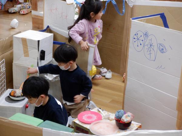いざ、来年入ってくるお友だちが保育室に来てくれると、ちょっと緊張している様子も見られましたが、少しずつ「一緒に遊ぼう」「これ使ってみる?」と自分から遊びに誘ったり、新しいお友だちの意を汲んでそっとお手伝いしたり、年少児なりに相手の気持ちを考えながら行動している姿をたくさん見ることができました。