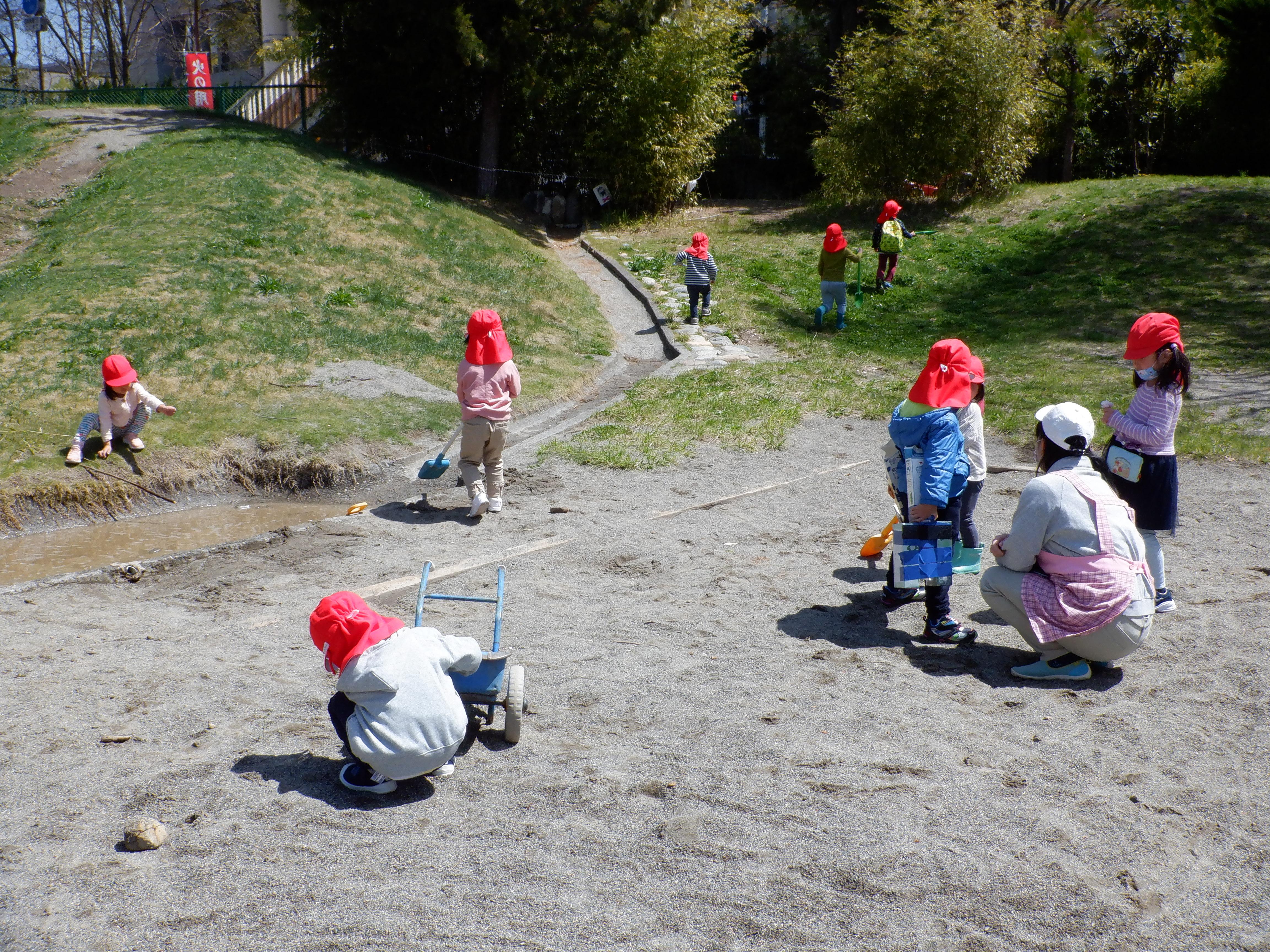 前庭の砂場も毎日にぎやかです。にぎやかさに比例するように,降園時「お洗濯お持ち帰り袋」もズラリと並ぶようになりました。