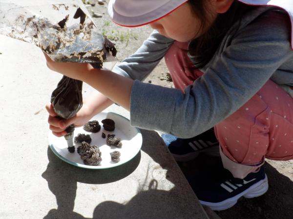 さてある日,年少さんがサラサラの土パウダーを作る様子を興味津々で見ていました。すると,年長さんが「さわってもいいよ」とさわらせてくれ,年少さんも「わあ」とにっこり。年少さんにとって,こんなすごいものを作ってしまう年長さんは憧れです。
