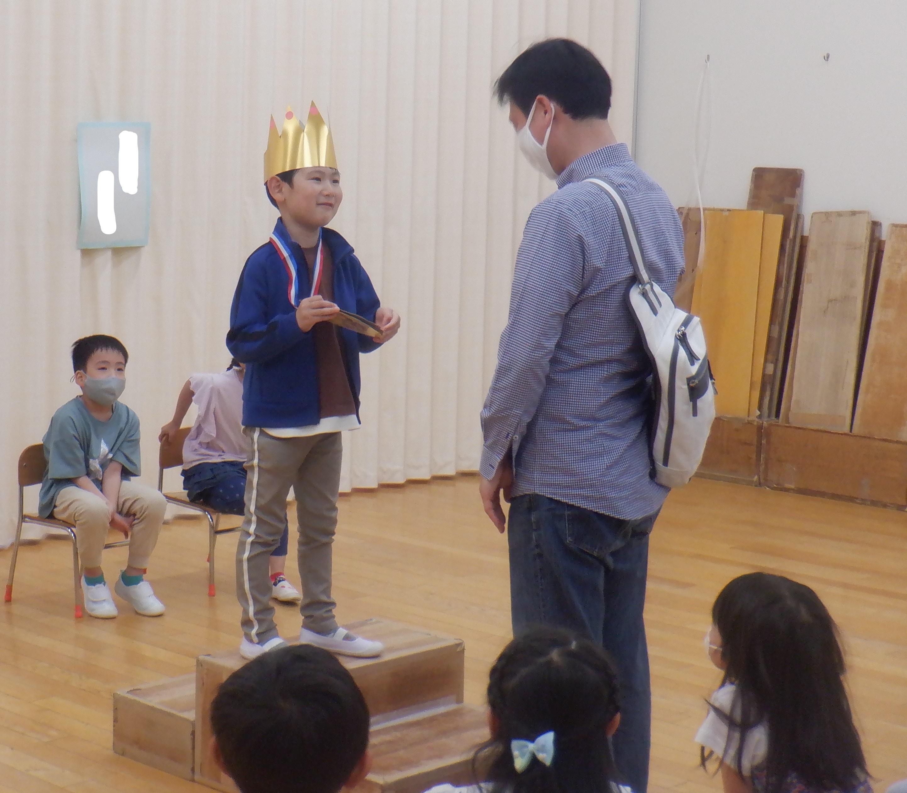 誕生会後,保育室に戻った年少さんは,早速ビールケースの上に登って,ヨーグルトの空き容器をマイクに「〇〇です。3歳になりました」と,お誕生会インタビューごっこをしていました。自分の出番が楽しみになりましたね。