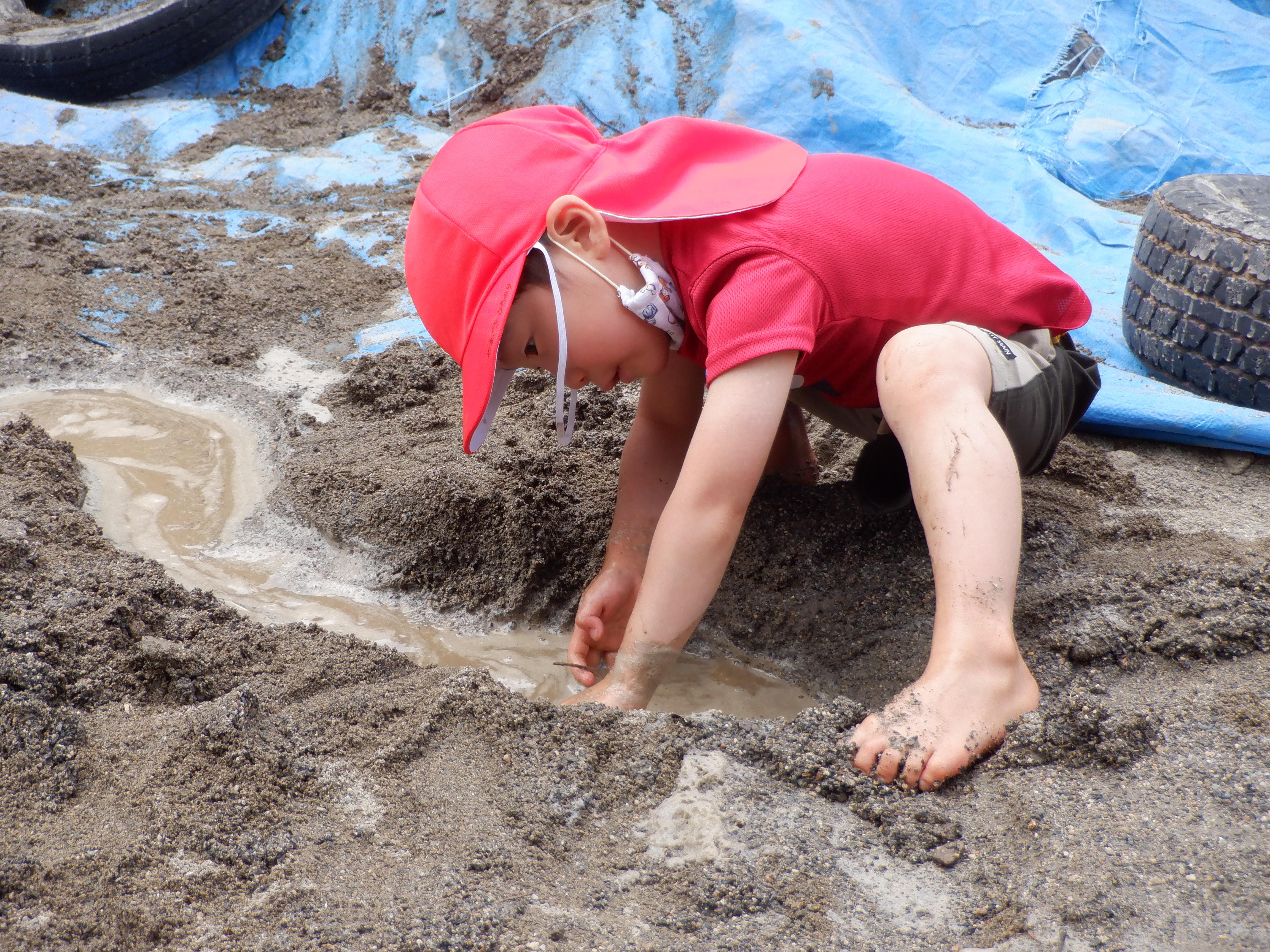 さくら組のお兄さんたちとちょっと離れたところで,年少のAくんは一人で「大きい川作る」と,両手を使って黙々と掘っています。ぐっと踏み込んだ足から夢中になっていること伝わってきます。