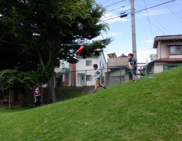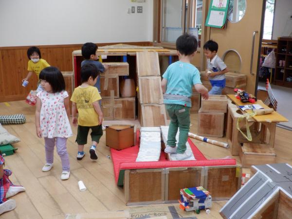 うめ組の子どもたちが声を掛け合いながら,保育室で使っていたマットを倉庫に運んでいました。夏休みに入るので,保育室もみんなできれいにしていたのですね。大人数で息を合わせながら運ぶのは難しいことなのに,みんなお祭りみたいでとても楽しそうでした。