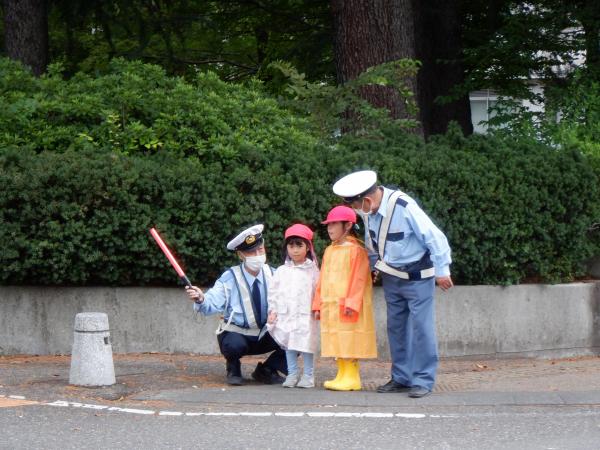 戻ってから交番所長さんに,歩き方をほめていただきにっこり。最後に「青信号は『渡れ』ではなく,『渡ってもよい』なので,必ず止まって安全確認をすること」「渡る時はしっかり手を挙げること」など,横断歩道の渡り方をもう一度教わりました。