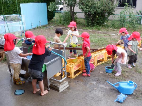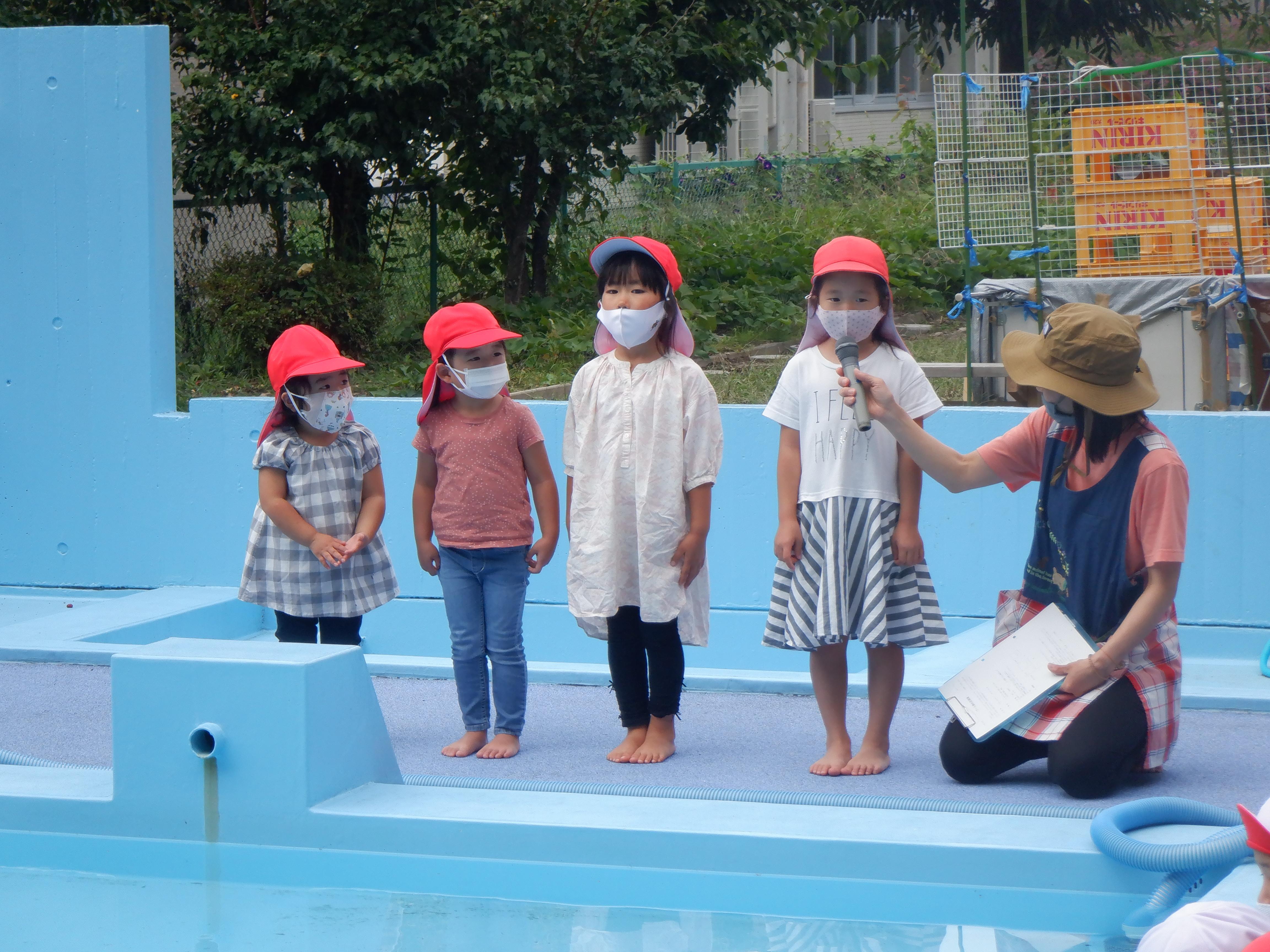 その後,みんなでプールに向かって「プールさん,ありがとうございました」とお礼のあいさつをしました。少し水が冷たい日もありましたが,園外保育で出かけた市民プールでの水遊びも含め,今年の夏もたくさん水に親しむことができたようです。