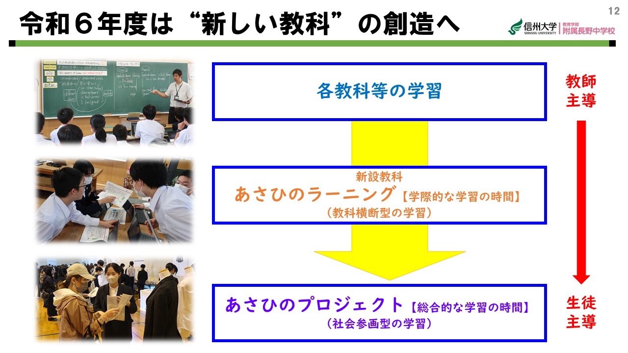今年度は、昨年度の生徒の活動の様子や本校の研究の方向性と、附属学校園としての使命を果たすために、昨年度から実施している社会参画型の学習「あさひのプロジェクト(総合的な学習の時間)」に加え、新しく実施する新教科「あさひのラーニング(学際的な学習の時間)」の概要について、実施内容などについて共有しました。