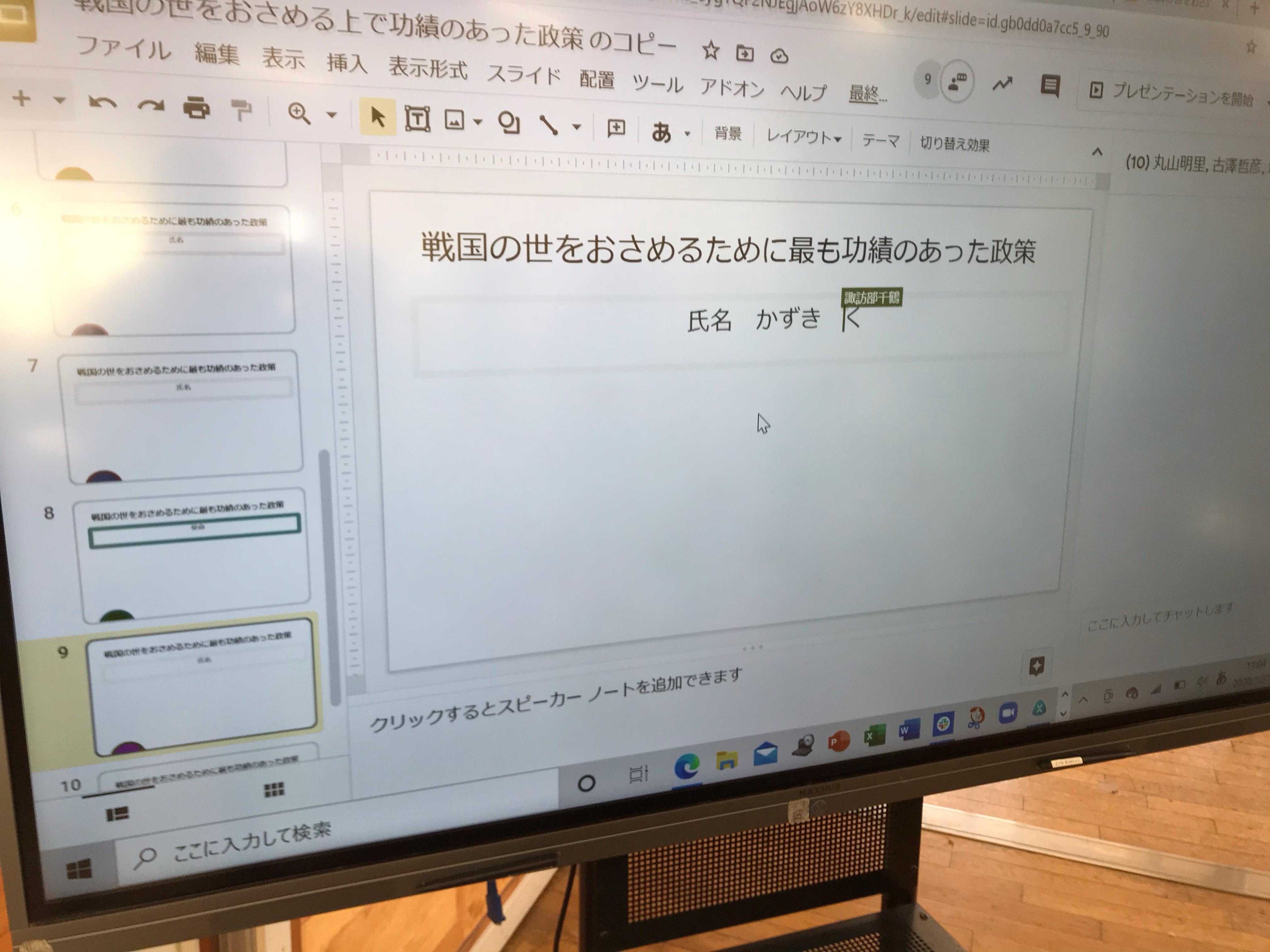 全員が、スライドに書き込んだり、書き込まれた友だちの意見を読んだりすることが出来るのですが、最初は、ファイルが開けなかったり、自分の書き込みを修正しようとしたところ、全部のスライドが消えてしまったりするハプニングも起こったりしました。Googleスライドの使い方に少し難しいところもありましたが、1時間の最後には全部の班が書き込むことができました。